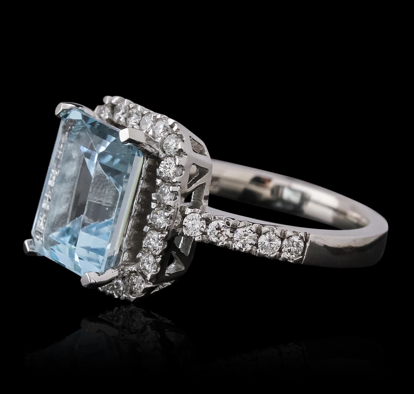 One electronically tested 14KT white gold ladies combination cast & assembled topaz and diamond ring with a flat shank with a bright polish finish. Identified with markings of "K14". Condition is new. Containing: One prong set emerald modified brilliant cut natural blue topaz, measuring 11.03 x 9.02 x 5.76mm, approximate weight of 5.46ct., clarity is eye clean, type I, medium light, slightly grayish, blue color, (GIA B 4/2), cut is good. Thirty-Two prong set round brilliant cut diamonds, measuring 1.50 - 1.50 x 0.90mm (depth est.) approximate total weight of 32 Stones = 0.39ct. Clarity: SI-1 to I-1. Color: I - J, Cut is Good. Colored gemstones are presumed to have been subjected to commonly used enhancement processes. All diamonds and colored gemstones are graded in the mounting, unless otherwise stated. Total Weight of Colored Stones 5.46ct. Total Weight of Diamonds 0.39ct. Total Weight of Ring 6.60 grams. GGL Appraised at $2,365.00.
