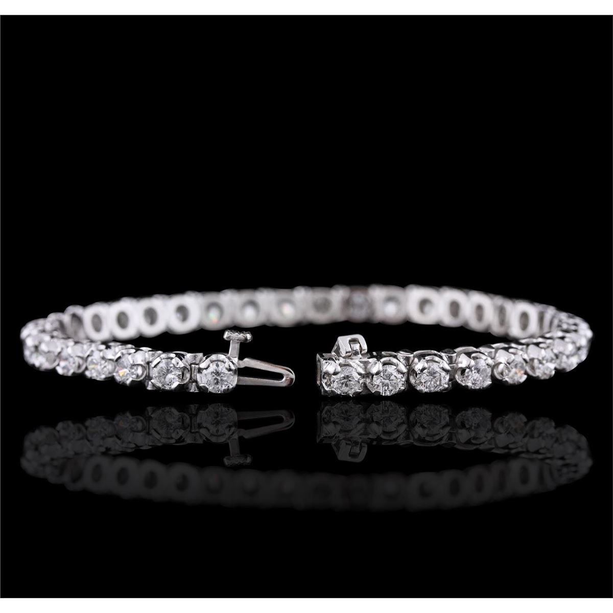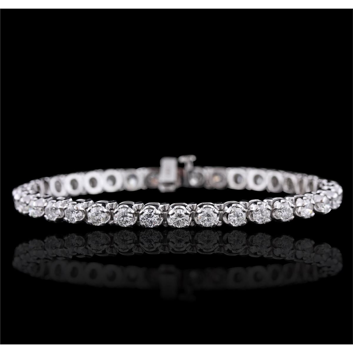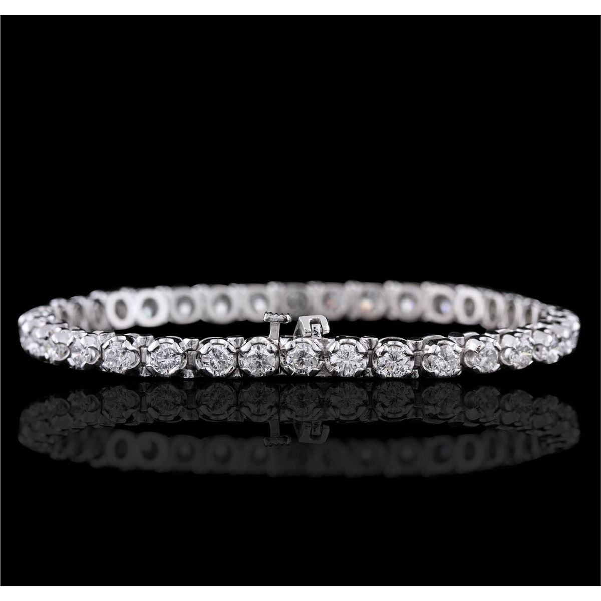One electronically tested 14KT white gold Ladies combination cast & assembled tennis bracelet with a hidden box clasp with a bright polish finish. Condition is new. Measurements: 7" in length. Identified with markings of "14K". Containing: Thirty-Five prong set round brilliant cut diamonds, measuring 3.50 - 3.50 x 2.10mm (depth est.) approximate. Total Weight of 35 Stones = 5.49ct. Clarity: I-1 to I-2. Color: H - J, Cut is Good. All diamonds are graded in the mounting, unless otherwise stated. Total Weight of Diamonds 5.49ct. Total Weight of Bracelet 14.70 grams. GGL Appraised at $15,370.00.