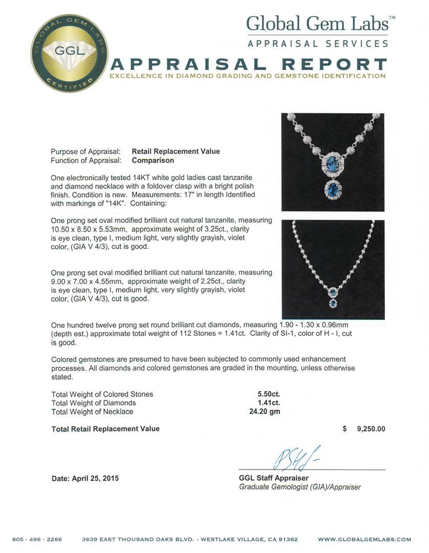 One electronically tested 14KT white gold ladies cast tanzanite and diamond necklace with a foldover clasp with a bright polish finish. Measurements: 17" in length Identified with markings of "14K". Condition is new. Containing: One prong set oval modified brilliant cut natural tanzanite, measuring 10.50 x 8.50 x 5.53mm, approximate weight of 3.25ct., clarity is eye clean, type I, medium light, very slightly grayish, violet color, (GIA V 4/3), cut is good. One prong set oval modified brilliant cut natural tanzanite, measuring 9.00 x 7.00 x 4.55mm, approximate weight of 2.25ct., clarity is eye clean, type I, medium light, very slightly grayish, violet color, (GIA V 4/3), cut is good. One Hundred Twelve prong set round brilliant cut diamonds, measuring 1.90 - 1.30 x 0.96mm (depth est.) approximate total weight of 112 Stones = 1.41ct. Clarity: SI-1. Color: H - I, Cut is Good. Colored gemstones are presumed to have been subjected to commonly used enhancement processes. All diamonds and colored gemstones are graded in the mounting, unless otherwise stated. Total Weight of Colored Stones 5.50ct. Total Weight of Diamonds 1.41ct. Total Weight of Necklace 24.20 grams. GGL Appraised at $9,250.00.