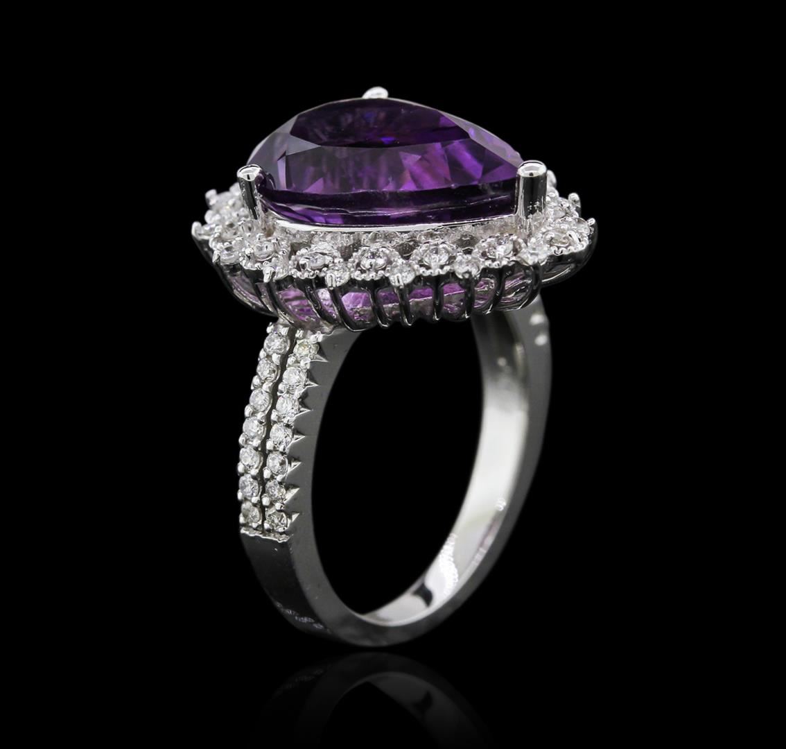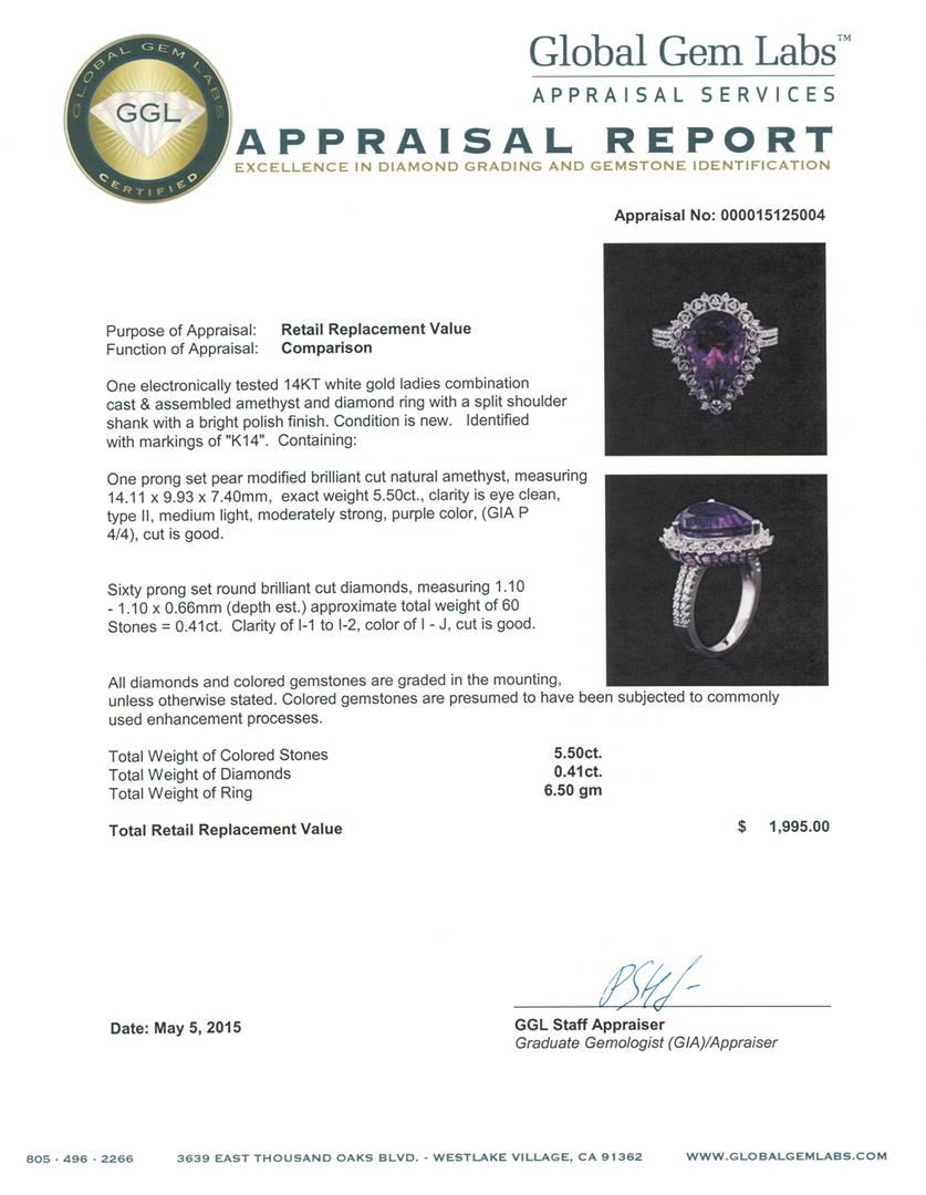 One electronically tested 14KT white gold ladies combination cast & assembled amethyst and diamond ring with a split shoulder shank with a bright polish finish. Identified with markings of "K14". Condition is new. Containing: One prong set pear modified brilliant cut natural amethyst, measuring 14.11 x 9.93 x 7.40mm, exact weight 5.50ct., clarity is eye clean, type II, medium light, moderately strong, purple color, (GIA P 4/4), cut is good. Sixty prong set round brilliant cut diamonds, measuring 1.10 - 1.10 x 0.66mm (depth est.) approximate total weight of 60 Stones = 0.41ct. Clarity: I-1 to I-2. Color: I - J, Cut is Good. All diamonds and colored gemstones are graded in the mounting, unless otherwise stated. Colored gemstones are presumed to have been subjected to commonly used enhancement processes.. Total Weight of Colored Stones 5.50ct. Total Weight of Diamonds 0.41ct. Total Weight of Ring 6.50 grams. GGL Appraised at $1,995.00.