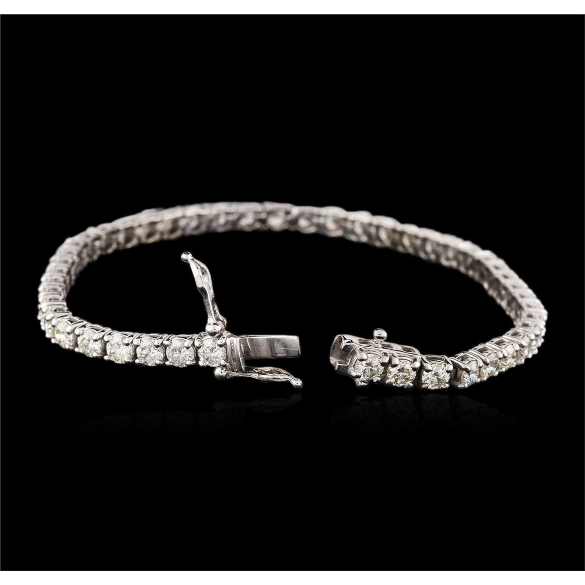 One electronically tested 14KT white gold ladies cast diamond tennis bracelet with a hidden box clasp with a bright and brushed finish. Measurements: 6.75" in length. Identified with markings of "14K". Condition is new. Containing: Forty-Six prong set round brilliant cut diamonds, measuring 3.20 - 3.20 x 1.92mm (depth est.) approximate total weight of 46 Stones = 5.52ct. Clarity: SI-2 to I-2. Color: J - K. All diamonds are graded in the mounting, unless otherwise stated. Total Weight of Diamonds 5.52ct. Total Weight of Tennis Bracelet 10.60 grams. GGL Appraised at $11,580.00.