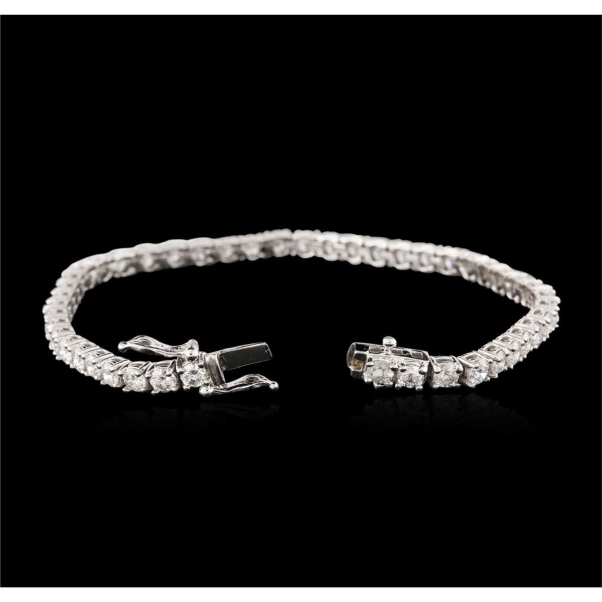 One electronically tested 14KT white gold ladies cast diamond tennis bracelet with a hidden box clasp with a bright and brushed finish. Measurements: 6.75." in length. Identified with markings of "14K". Condition is new. Containing: Forty-Six prong set round brilliant cut diamonds, measuring 3.20 - 3.20 x 1.92mm (depth est.) approximate total weight of 46 Stones = 5.52ct. Clarity: SI-2 to I-2. Color: I - K. All diamonds are graded in the mounting, unless otherwise stated. Total Weight of Diamonds 5.52ct. Total Weight of Tennis Bracelet 10.80 grams. GGL Appraised at $11,625.00.