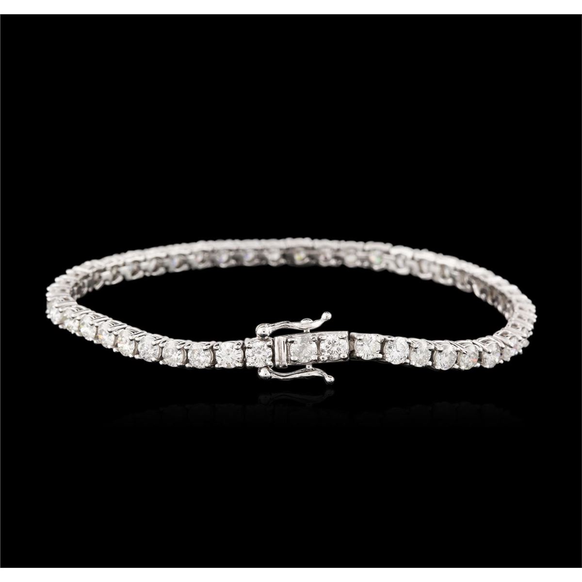 One electronically tested 14KT white gold ladies cast diamond tennis bracelet with a hidden box clasp with a bright and brushed finish. Measurements: 6.75." in length. Identified with markings of "14K". Condition is new. Containing: Forty-Six prong set round brilliant cut diamonds, measuring 3.20 - 3.20 x 1.92mm (depth est.) approximate total weight of 46 Stones = 5.52ct. Clarity: SI-2 to I-2. Color: I - K. All diamonds are graded in the mounting, unless otherwise stated. Total Weight of Diamonds 5.52ct. Total Weight of Tennis Bracelet 10.80 grams. GGL Appraised at $11,625.00.