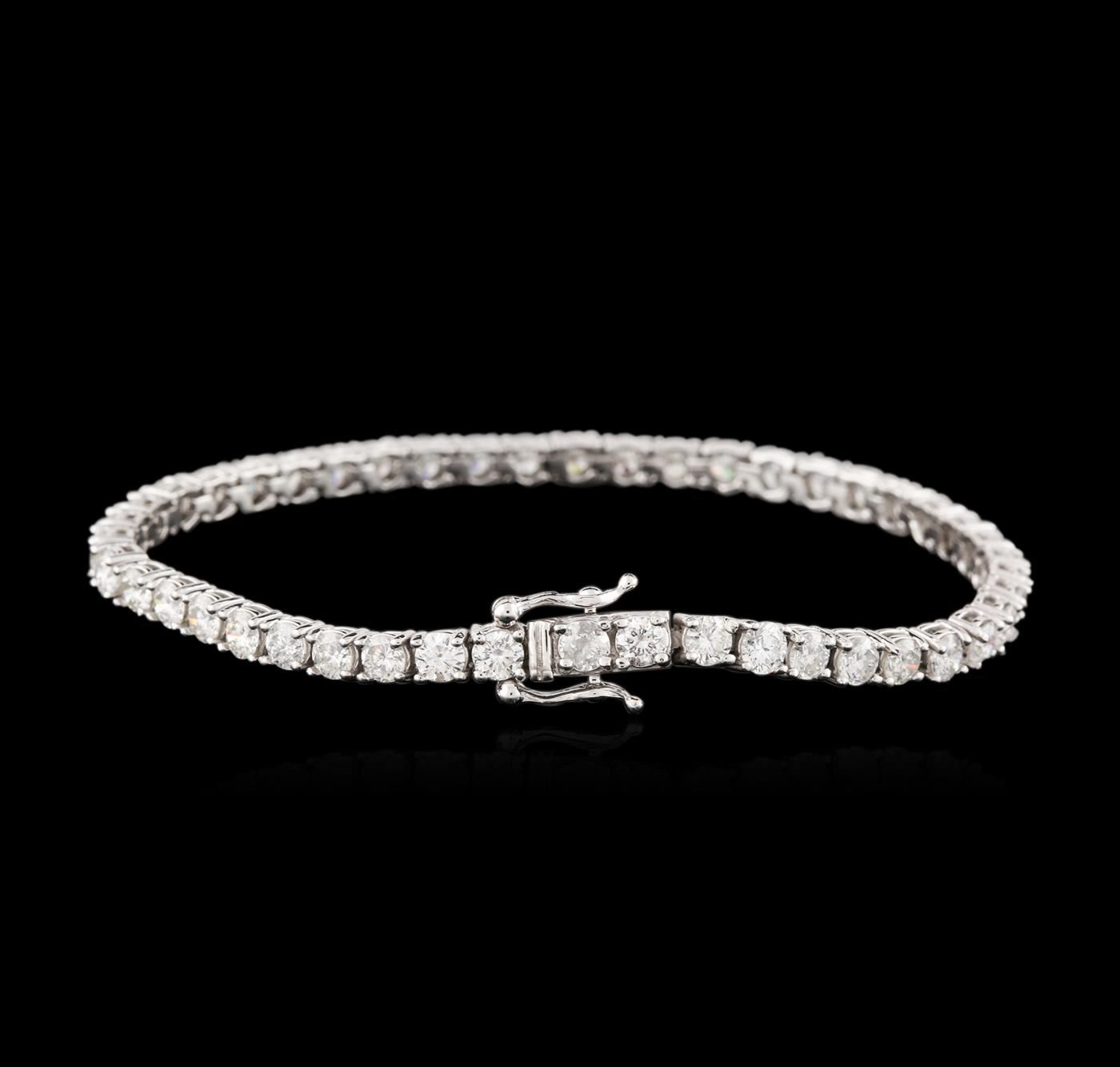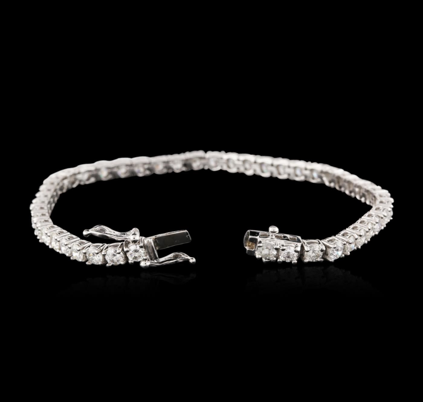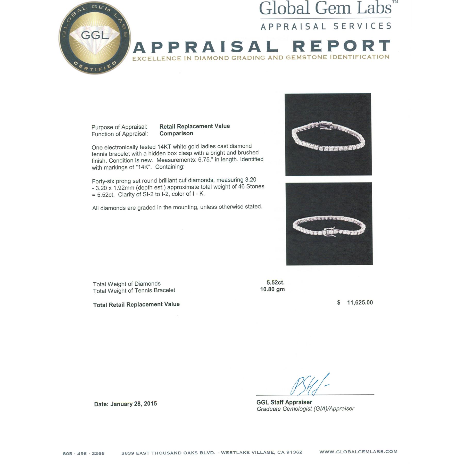 One electronically tested 14KT white gold ladies cast diamond tennis bracelet with a hidden box clasp with a bright and brushed finish. Measurements: 6.75." in length. Identified with markings of "14K". Condition is new. Containing: Forty-Six prong set round brilliant cut diamonds, measuring 3.20 - 3.20 x 1.92mm (depth est.) approximate total weight of 46 Stones = 5.52ct. Clarity: SI-2 to I-2. Color: I - K. All diamonds are graded in the mounting, unless otherwise stated. Total Weight of Diamonds 5.52ct. Total Weight of Tennis Bracelet 10.80 grams. GGL Appraised at $11,625.00.