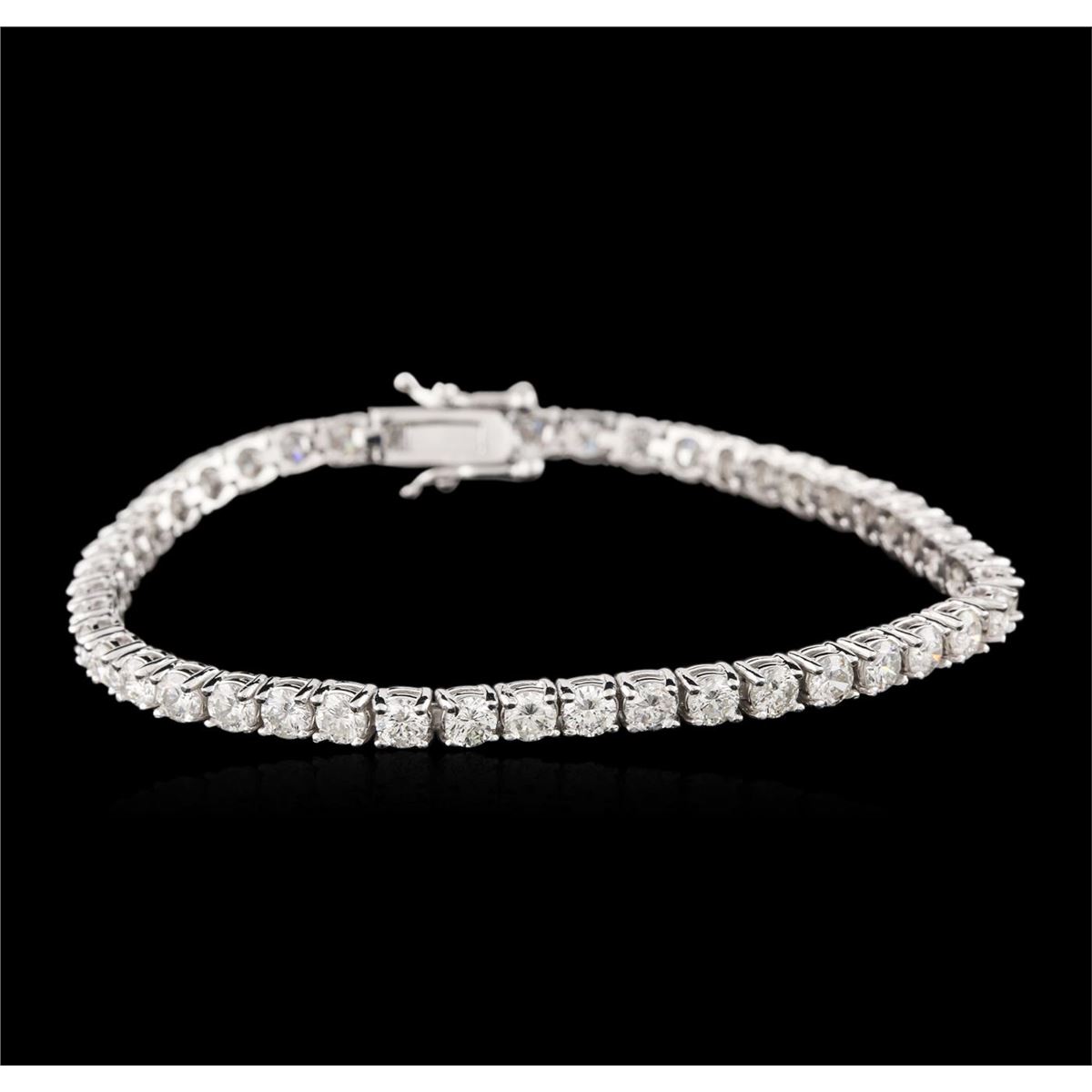 One electronically tested 14KT white gold ladies cast diamond tennis bracelet with a hidden box clasp with a bright and brushed finish. Measurements: 6.75." in length. Identified with markings of "14K". Condition is new. Containing: Forty-Six prong set round brilliant cut diamonds, measuring 3.20 - 3.20 x 1.92mm (depth est.) approximate total weight of 46 Stones = 5.52ct. Clarity: SI-2 to I-2. Color: I - K. All diamonds are graded in the mounting, unless otherwise stated. Total Weight of Diamonds 5.52ct. Total Weight of Tennis Bracelet 10.50 grams. GGL Appraised at $11,555.00.