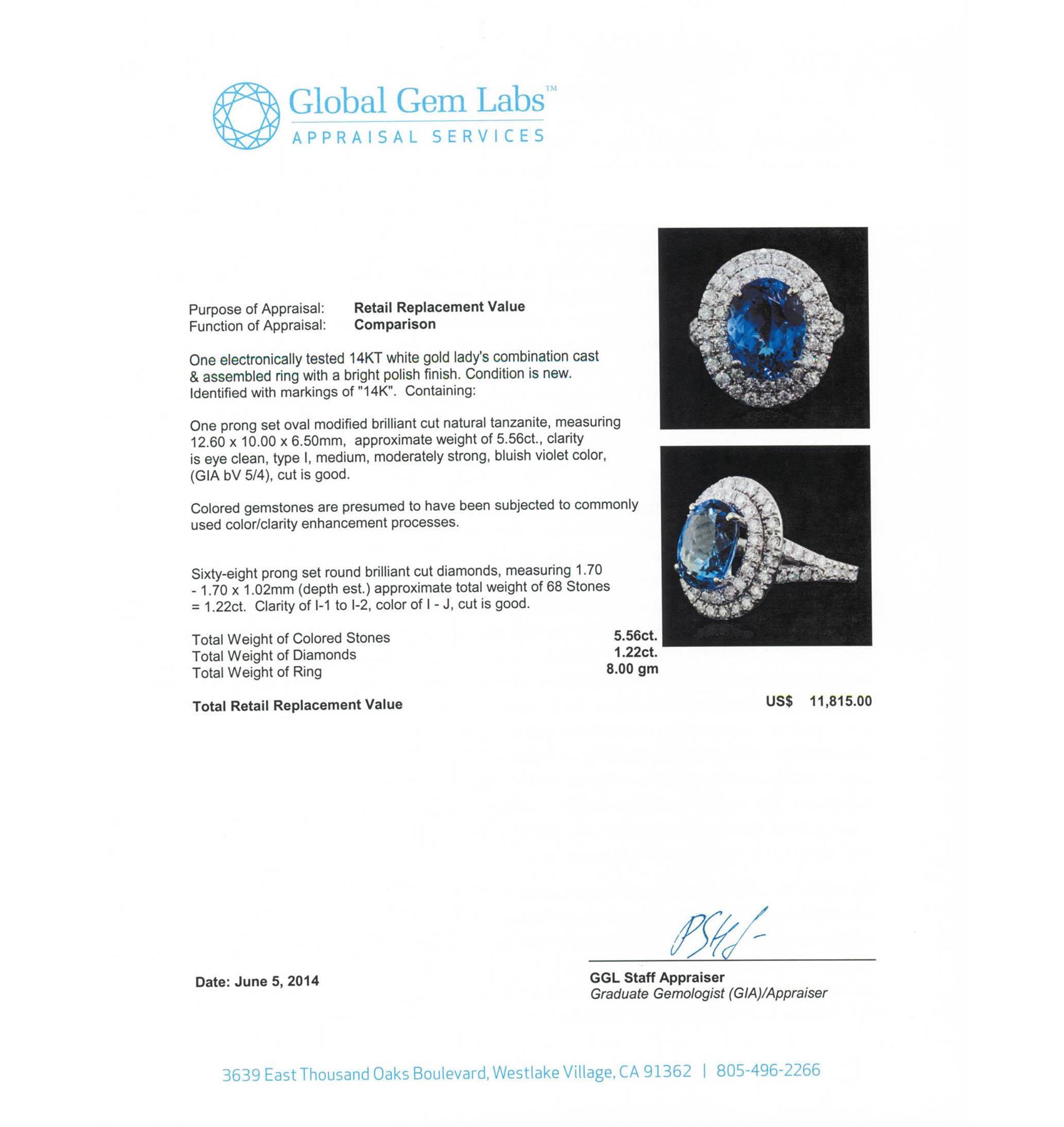 One electronically tested 14KT white gold Ladies combination cast & assembled ring with a bright polish finish. Condition is new. Identified with markings of "14K". Containing: One prong set oval modified brilliant cut natural tanzanite, measuring 12.60 x 10.00 x 6.50mm, approximate weight of 5.56ct., clarity is eye clean, type I, medium, moderately strong, bluish violet color, (GIA bV 5/4), cut is good. Colored gemstones are presumed to have been subjected to commonly used color/clarity enhancement processes. Sixty-Eight prong set round brilliant cut diamonds, measuring 1.70 - 1.70 x 1.02mm (depth est.) approximate. Total Weight of 68 Stones = 1.22ct. Clarity: I-1 to I-2. Color: I - J, Cut is Good. Total Weight of Colored Stones 5.56ct. Total Weight of Diamonds 1.22ct. Total Weight of Ring 8.00 grams. GGL Appraised at $11,815.00.