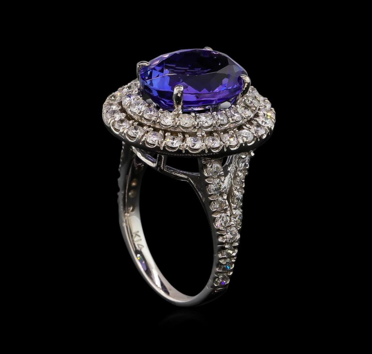 One electronically tested 14KT white gold Ladies combination cast & assembled ring with a bright polish finish. Condition is new. Identified with markings of "14K". Containing: One prong set oval modified brilliant cut natural tanzanite, measuring 12.60 x 10.00 x 6.50mm, approximate weight of 5.56ct., clarity is eye clean, type I, medium, moderately strong, bluish violet color, (GIA bV 5/4), cut is good. Colored gemstones are presumed to have been subjected to commonly used color/clarity enhancement processes. Sixty-Eight prong set round brilliant cut diamonds, measuring 1.70 - 1.70 x 1.02mm (depth est.) approximate. Total Weight of 68 Stones = 1.22ct. Clarity: I-1 to I-2. Color: I - J, Cut is Good. Total Weight of Colored Stones 5.56ct. Total Weight of Diamonds 1.22ct. Total Weight of Ring 8.00 grams. GGL Appraised.