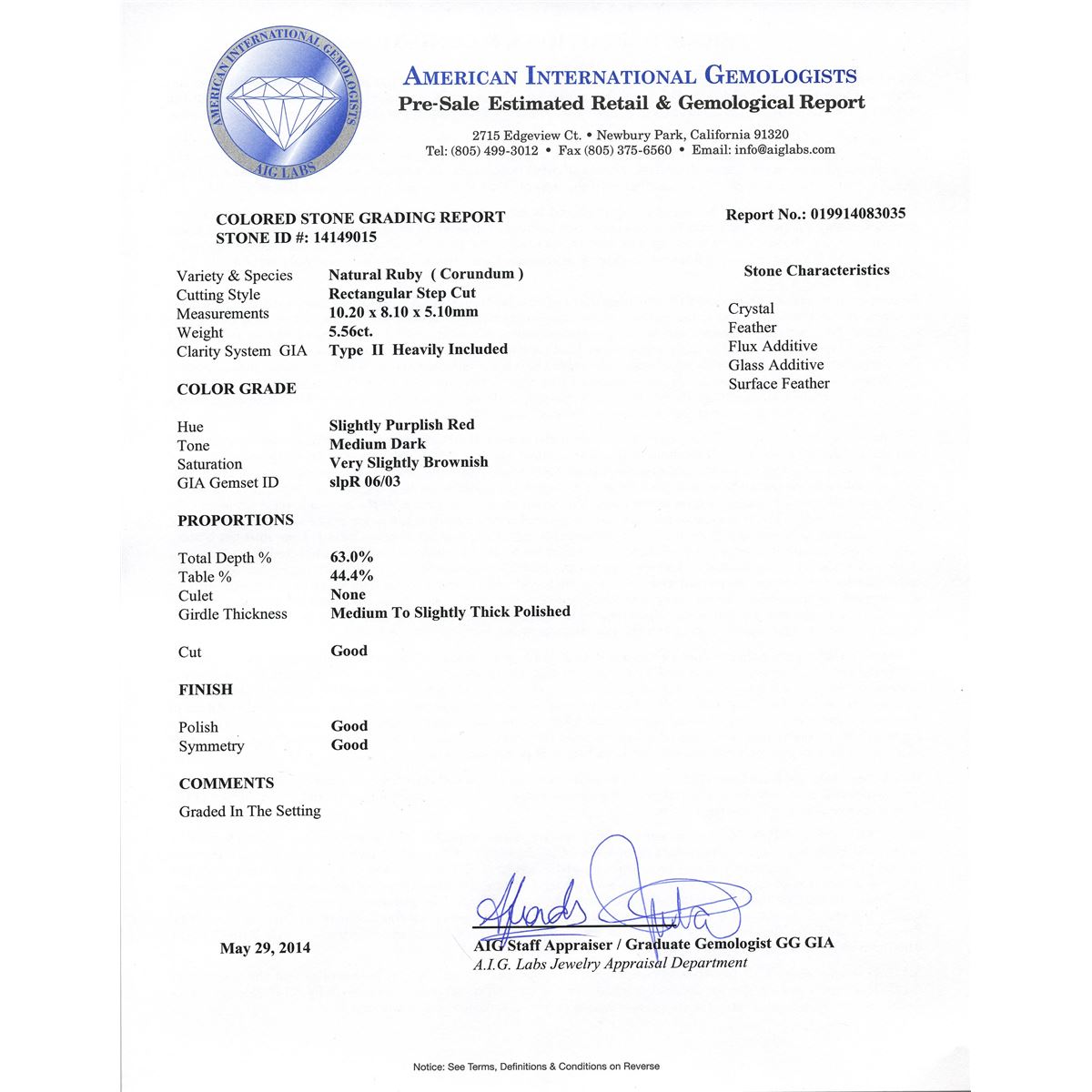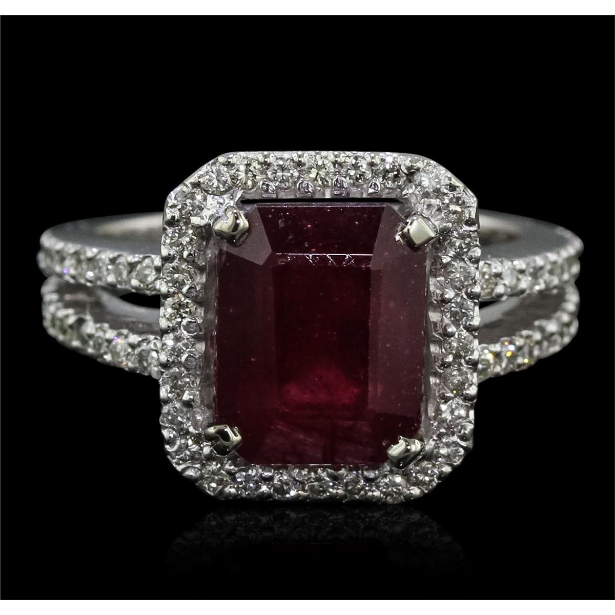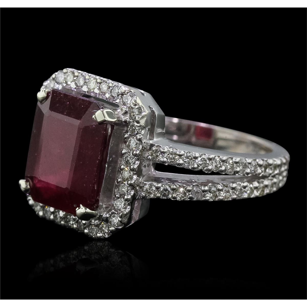 One electronically tested 14KT white gold ladies cast ruby and diamond ring with a bright polish finish. Condition is new, good workmanship. The featured ruby is set within a diamond bezel supported by diamond set split shoulders, completed by a two and one-half millimeter wide band. Identified with markings of "14K". Containing: One prong set rectangular step cut natural ruby, measuring 10.20 x 8.10 x 5.10mm, 10%. bulge factor, approximate weight of 5.56ct., clarity is heavily included, type II, medium dark, very slightly brownish, slightly purplish red color, (GIA slpR 6/3), cut is good. Transmitting light somewhat diffusely, transparent to translucent. Naturally occurring internal & external characteristics are present. Indications of laboratory high temperature heat treatment, with glass & flux additives. Colored Stone Grading Report attached. Graded in the setting. Ruby has a low tolerance to rhodium plating, repolishing the surface, & ultrasonic cleaning. Seventy-Eight prong set round brilliant cut diamonds, measuring 1.40 - 1.30 x 0.81mm (depth est.) approximate. Total Weight of 78 Stones = 0.80ct. Graded in the setting. Clarity: SI-1 to I-1 . Color: H - J. Total Weight of Colored Stones 5.56ct.. Total Weight of Diamonds 0.80ct.. Total Weight of Ring 7.56gm. AIG Appraised at $5,415.00.