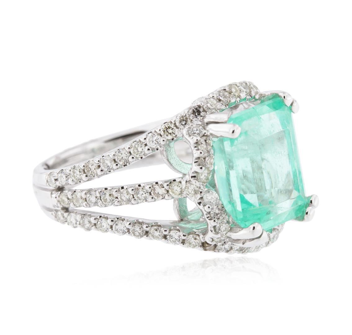 New Condition! MK9714NG. One electronically tested 14KT white gold ladies cast emerald and diamond ring with a bright polish finish. Condition is new, good workmanship. The featured emerald I set within diamond bezel, supported by split shoulders and completed by a three and one-half millimeter wide band. Identified with markings of "K14". Containing: One prong set rectangular step cut natural emerald, measuring 11.25 x 9.30 x 6.05mm, 65 bulge factor, approximate weight of 5.58ct., clarity is moderately included, type III, medium light, very slightly grayish, very slightly bluish green color, (GIA vslbG 4/3), cut is good. Transmitting light with a minimum of distortion, transparent. Naturally occurring internal & external characteristics are present. Indications of oil, & opticon residue. Colored stone grading report attached. Graded in the setting. Ninety-six prong set round brilliant cut diamonds, measuring 1.50 - 1.50 x 0.90mm (depth est.) approximate total weight of 96 stones = 1.28ct. Graded in the setting. Clarity SI-2 to I-2. Color I-J. Total weight of emerald 5.58ct. Total weight of diamonds 1.28ct. Total weight of Ring 8.70gm. AIG appraised at $10,800.00. Thank you for viewing this lot! We are always adding new inventory and new auctions, so please check back often. We appreciate your business and support. Enjoy the auction! SAA - Seized Assets Auctioneers. AIG Appraised.