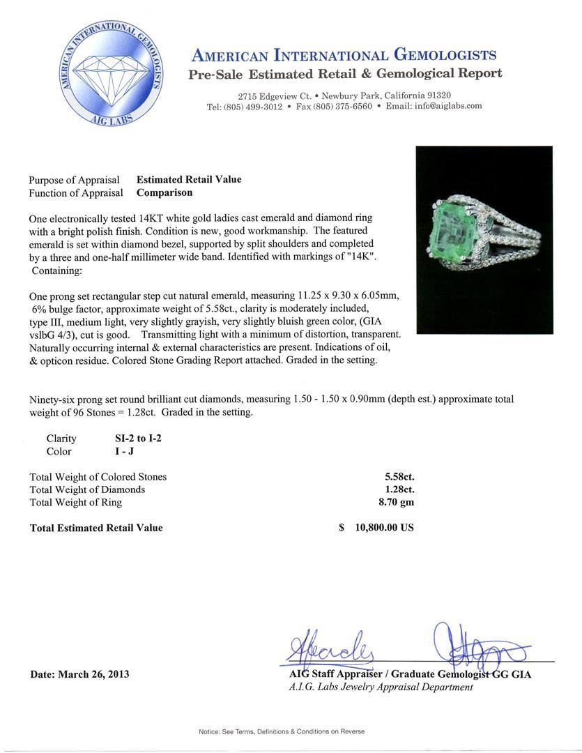 New Condition! MK9714NG. One electronically tested 14KT white gold ladies cast emerald and diamond ring with a bright polish finish. Condition is new, good workmanship. The featured emerald I set within diamond bezel, supported by split shoulders and completed by a three and one-half millimeter wide band. Identified with markings of "K14". Containing: One prong set rectangular step cut natural emerald, measuring 11.25 x 9.30 x 6.05mm, 65 bulge factor, approximate weight of 5.58ct., clarity is moderately included, type III, medium light, very slightly grayish, very slightly bluish green color, (GIA vslbG 4/3), cut is good. Transmitting light with a minimum of distortion, transparent. Naturally occurring internal & external characteristics are present. Indications of oil, & opticon residue. Colored stone grading report attached. Graded in the setting. Ninety-six prong set round brilliant cut diamonds, measuring 1.50 - 1.50 x 0.90mm (depth est.) approximate total weight of 96 stones = 1.28ct. Graded in the setting. Clarity SI-2 to I-2. Color I-J. Total weight of emerald 5.58ct. Total weight of diamonds 1.28ct. Total weight of Ring 8.70gm. AIG appraised at $10,800.00. Thank you for viewing this lot! We are always adding new inventory and new auctions, so please check back often. We appreciate your business and support. Enjoy the auction! SAA - Seized Assets Auctioneers. AIG Appraised.