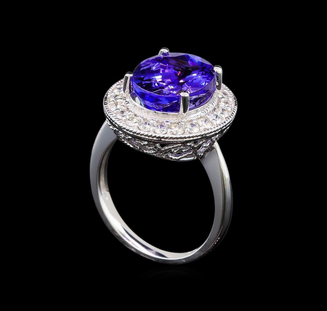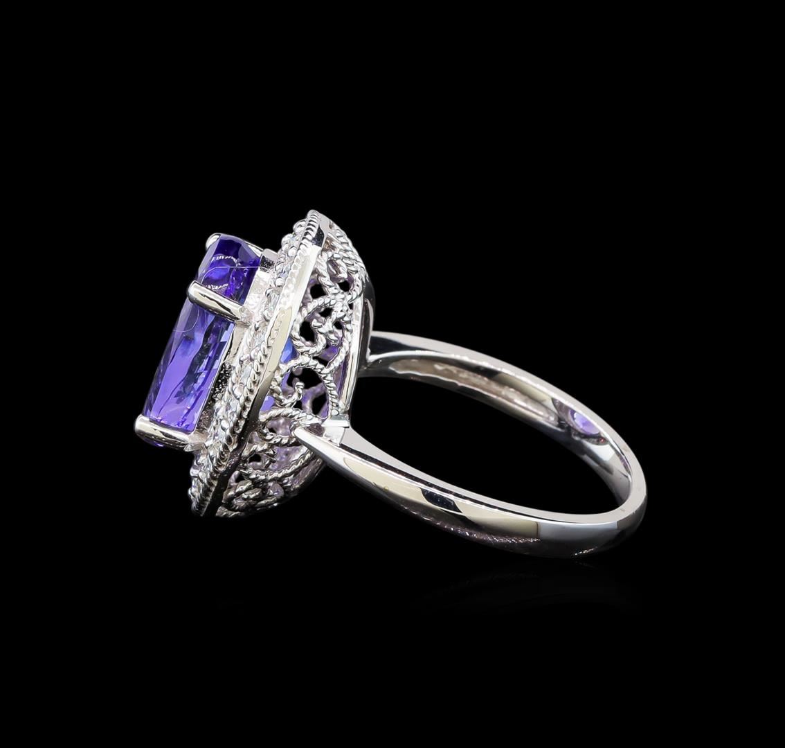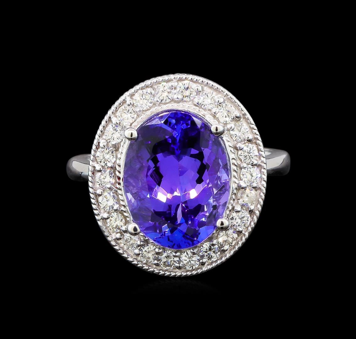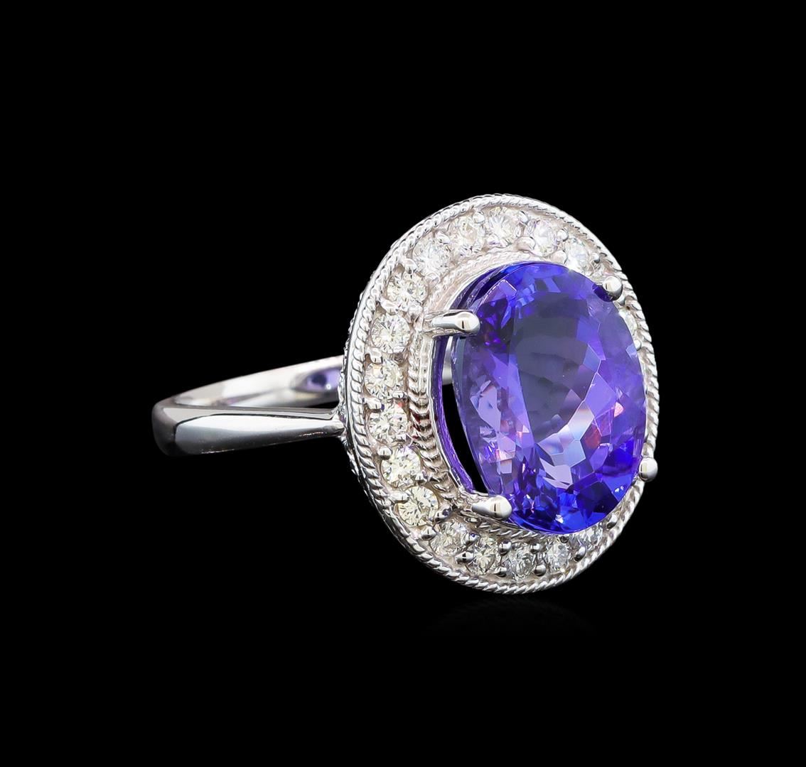One electronically tested 14KT white gold ladies cast tanzanite and diamond ring with a bright polish finish. Identified with markings of "14K". Condition is new. Containing: One prong set oval modified brilliant cut natural tanzanite, measuring 12.56 x 9.53 x 6.66mm, approximate weight of 5.61ct., clarity is eye clean, type I, medium light, moderately strong, bluish violet color, (GIA bV 4/4), cut is good. Twenty-Two prong set round brilliant cut diamonds, measuring 1.80 - 1.80 x 1.08mm (depth est.) approximate total weight of 22 Stones = 0.47ct. Clarity: SI-1 to SI-2. Color: I - J, Cut is Good. Colored gemstones are presumed to have been subjected to commonly used enhancement processes. All diamonds and colored gemstones are graded in the mounting, unless otherwise stated. Total Weight of Colored Stones 5.61ct. Total Weight of Diamonds 0.47ct. Total Weight of Ring 6.70 grams. GGL Appraised at $6,160.00.