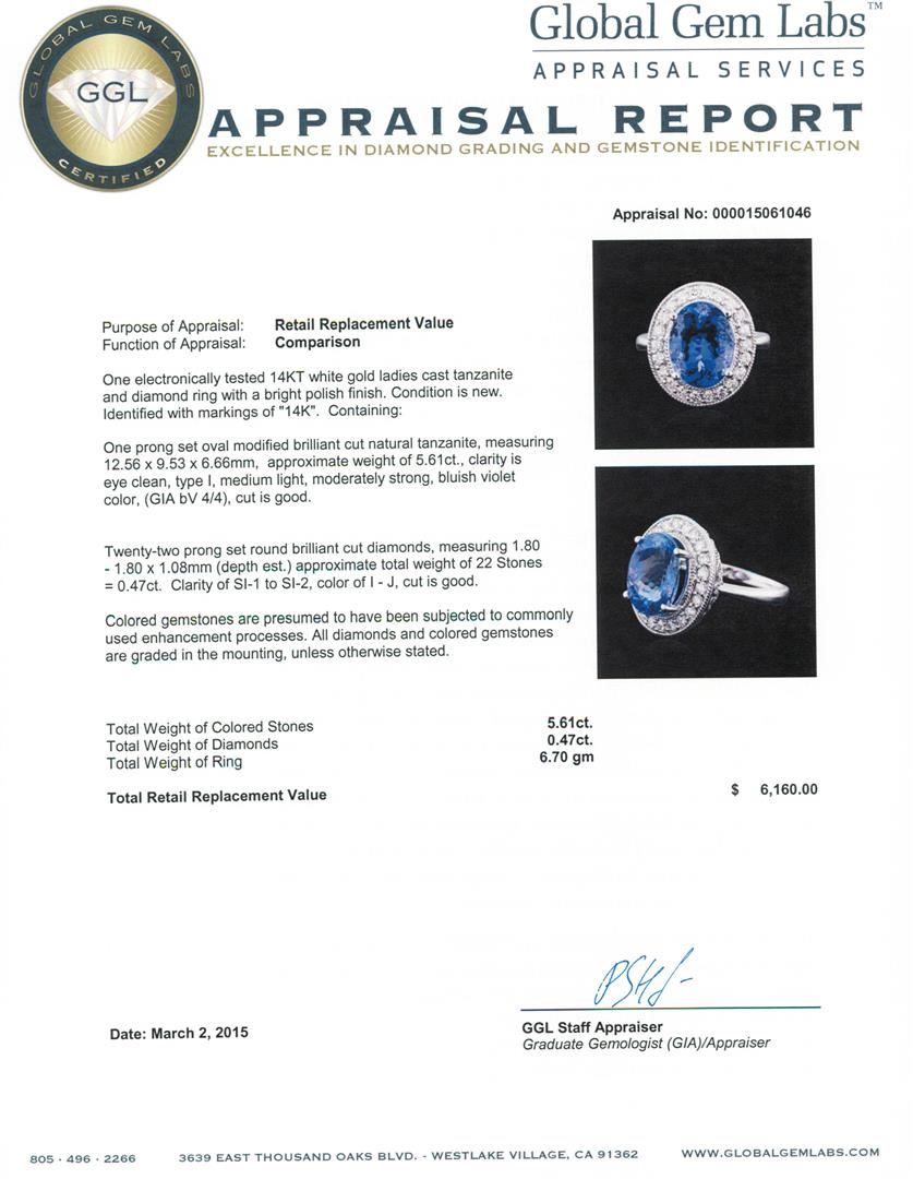 One electronically tested 14KT white gold ladies cast tanzanite and diamond ring with a bright polish finish. Identified with markings of "14K". Condition is new. Containing: One prong set oval modified brilliant cut natural tanzanite, measuring 12.56 x 9.53 x 6.66mm, approximate weight of 5.61ct., clarity is eye clean, type I, medium light, moderately strong, bluish violet color, (GIA bV 4/4), cut is good. Twenty-Two prong set round brilliant cut diamonds, measuring 1.80 - 1.80 x 1.08mm (depth est.) approximate total weight of 22 Stones = 0.47ct. Clarity: SI-1 to SI-2. Color: I - J, Cut is Good. Colored gemstones are presumed to have been subjected to commonly used enhancement processes. All diamonds and colored gemstones are graded in the mounting, unless otherwise stated. Total Weight of Colored Stones 5.61ct. Total Weight of Diamonds 0.47ct. Total Weight of Ring 6.70 grams. GGL Appraised at $6,160.00.