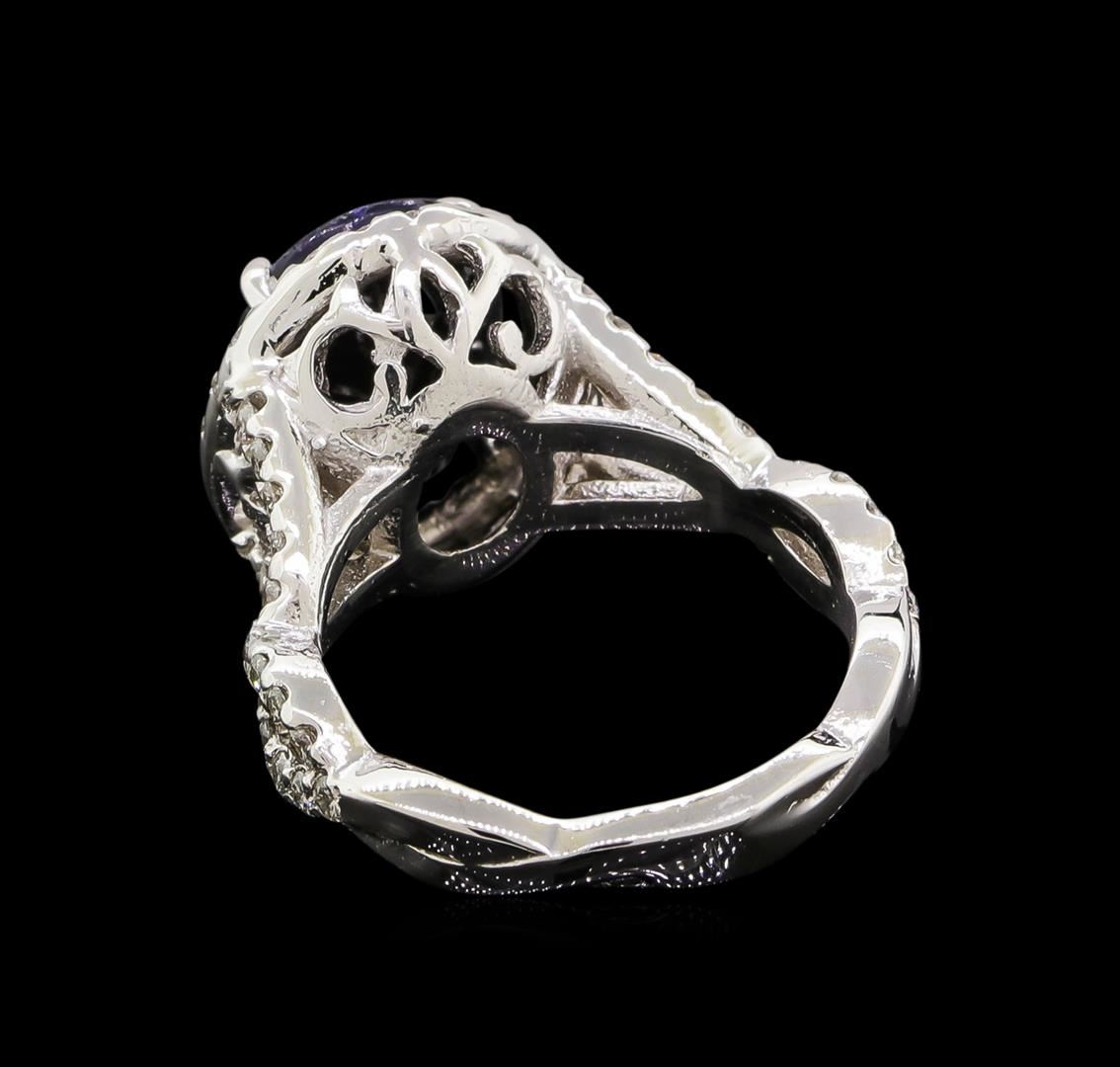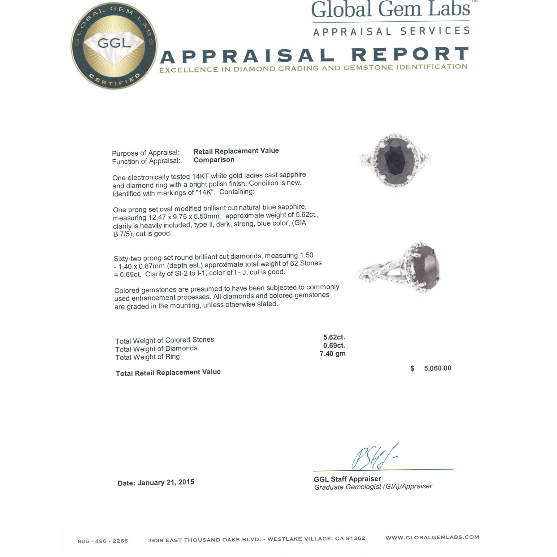 One electronically tested 14KT white gold ladies cast sapphire and diamond ring with a bright polish finish. Identified with markings of "14K". Condition is new. Containing: One prong set oval modified brilliant cut natural blue sapphire, measuring 12.47 x 9.75 x 5.50mm, approximate weight of 5.62ct., clarity is heavily included, type II, dark, strong, blue color, (GIA B 7/5), cut is good. Sixty-Two prong set round brilliant cut diamonds, measuring 1.50 - 1.40 x 0.87mm (depth est.) approximate total weight of 62 Stones = 0.69ct. Clarity: SI-2 to I-1. Color: I - J, Cut is Good. Colored gemstones are presumed to have been subjected to commonly used enhancement processes. All diamonds and colored gemstones are graded in the mounting, unless otherwise stated. Total Weight of Colored Stones 5.62ct. Total Weight of Diamonds 0.69ct. Total Weight of Ring 7.40 grams. GGL Appraised at $5,060.00.
