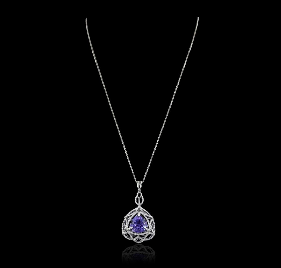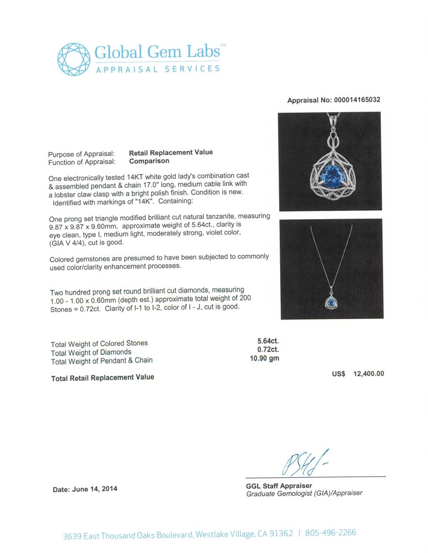 One electronically tested 14KT white gold Ladies combination cast & assembled pendant & chain 17.0" long, medium cable link with a lobster claw clasp with a bright polish finish. Condition is new. Identified with markings of "14K". Containing: One prong set triangle modified brilliant cut natural tanzanite, measuring 9.87 x 9.87 x 9.60mm, approximate weight of 5.64ct., clarity is eye clean, type I, medium light, moderately strong, violet color, (GIA V 4/4), cut is good. Colored gemstones are presumed to have been subjected to commonly used color/clarity enhancement processes. Two Hundred prong set round brilliant cut diamonds, measuring 1.00 - 1.00 x 0.60mm (depth est.) approximate. Total Weight of 200 Stones = 0.72ct. Clarity: I-1 to I-2. Color: I - J, Cut is Good. Total Weight of Colored Stones 5.64ct. Total Weight of Diamonds 0.72ct. Total Weight of Pendant & Chain 10.90 grams. GGL Appraised at $12,400.00.