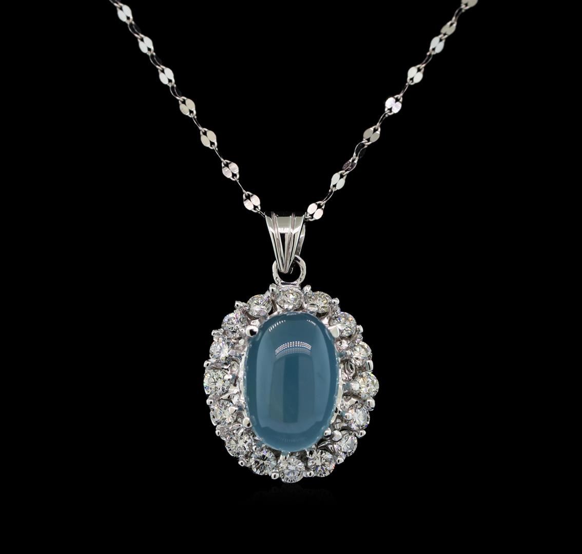 One electronically tested 14KT white gold ladies cast aquamarine and diamond pendant & chain 18.0" long, with a spring ring clasp with a bright polish finish. Identified with markings of "14K". Condition is new. Containing: One prong set oval cabochon cut natural aquamarine, measuring 13.40 x 9.00 x 5.85mm, approximate weight of 5.67ct., clarity is heavily included, type I, medium, very slightly grayish, blue color, (GIA B 5/3), cut is good. Sixteen prong set round brilliant cut diamonds, measuring 2.50 - 2.50 x 1.50mm (depth est.) approximate total weight of 16 Stones = 1.10ct. Clarity: SI-1 to I-1. Color: H - I, Cut is Good. Colored gemstones are presumed to have been subjected to commonly used enhancement processes. All diamonds and colored gemstones are graded in the mounting, unless otherwise stated. Total Weight of Colored Stones 5.67ct. Total Weight of Diamonds 1.10ct. Total Weight of Pendant & Chain 5.50 grams. GGL Appraised at $3,540.00.