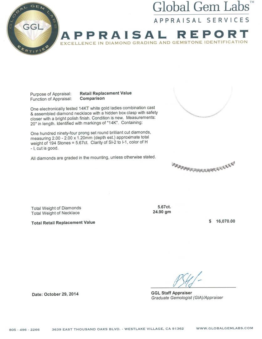 One electronically tested 14KT white gold ladies combination cast & assembled diamond necklace with a hidden box clasp with safety closer with a bright polish finish. Measurements: 20 in length. Identified with markings of 14K. Condition is new. Containing: One Hundred Ninety-Four prong set round brilliant cut diamonds, measuring 2.00 - 2.00 x 1.20mm (depth est.) approximate total weight of 194 Stones = 5.67ct. Clarity: SI-2 to I-1. Color: H - I, Cut is Good. All diamonds are graded in the mounting, unless otherwise stated. Total Weight of Diamonds 5.67ct. Total Weight of Necklace 24.90 grams. GGL Appraised.