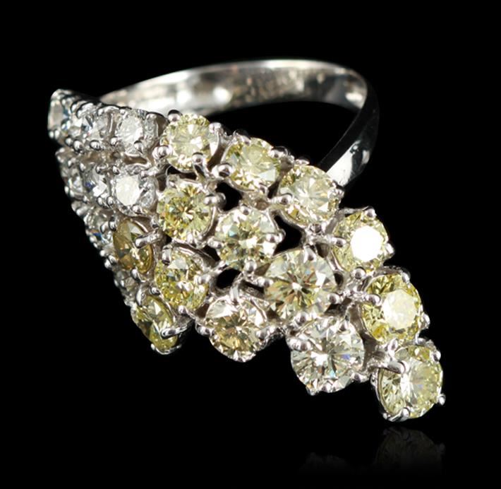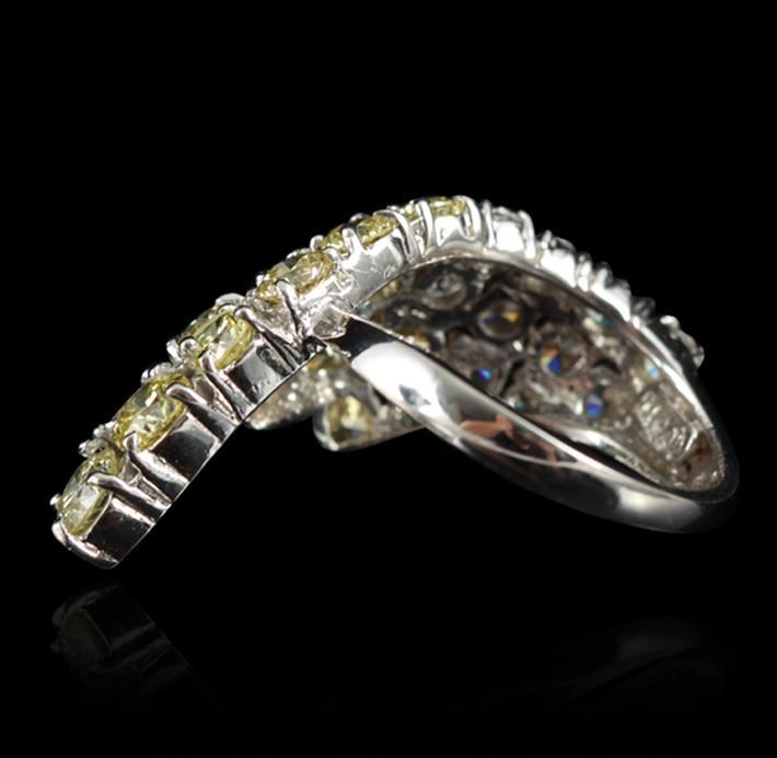 One electronically tested 14KT white gold ladies cast diamond waterfall ring with a bright polish finish. Condition is new, good workmanship. The ring features a cascading bouquet of diamonds completed by a three millimeter wide band. Identified with markings of "K14". Containing: Eleven prong set round brilliant cut diamonds, measuring 3.40 - 2.70 x 1.83mm (depth est.) approximate total weight of 11 stones = 1.31ct. Graded in the setting. Clarity SI-1 to SI-2. Color I-K. Fourteen prong set round brilliant cut diamonds, measuring 4.90 - 3.80 x 2.61mm (depth est.) approximate total weight of 14 stones = 4.36ct. The group includes a mix of natural color and irradiated enhanced color diamonds ranging from very light yellow to fancy yellow diamonds, Graded in the setting. Clarity SI-1 to SI-2. Total weight of Diamonds 5.67ct. Total weight of Ring 7.80gm. AIG Appraised at $21,960.00.