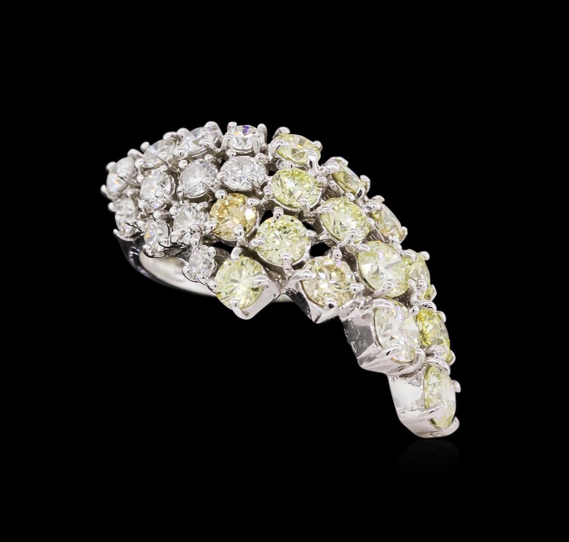 One electronically tested 14KT white gold ladies cast diamond waterfall ring with a bright polish finish. Condition is new, good workmanship. The ring features a cascading bouquet of diamonds completed by a three millimeter wide band. Identified with markings of "K14". Containing: Eleven prong set round brilliant cut diamonds, measuring 3.40 -- 2.70 x 1.83mm (depth est.) approximate total weight of 11 stones = 1.31ct. Graded in the setting. Clarity SI-1 to SI-2. Color I-K. Fourteen prong set round brilliant cut diamonds, measuring 4.90 -- 3.80 x 2.61mm (depth est.) approximate total weight of 14 stones = 4.36ct. The group includes a mix of natural color and irradiated enhanced color diamonds ranging from very light yellow to fancy yellow diamonds, Graded in the setting. Clarity SI-1 to SI-2. Total weight of Diamonds 5.67ct. Total weight of Ring 7.80gm. AIG Appraised at $21,960.00.
