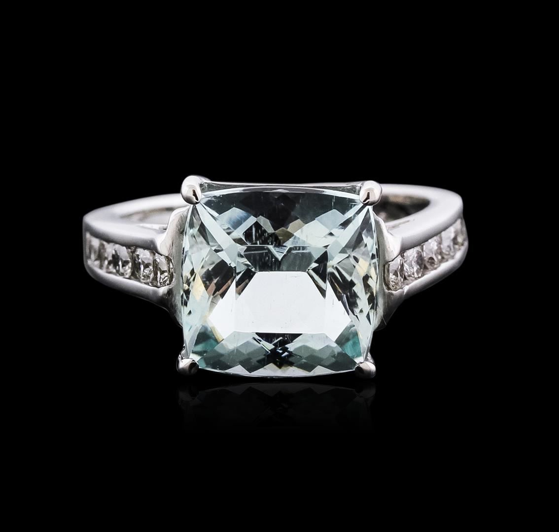 One ring featuring: 14KT white gold weighing 6.45 grams containing one princess cut aquamarine center weighing 5.70ct and round cut diamonds weighing a total of 0.35ct.