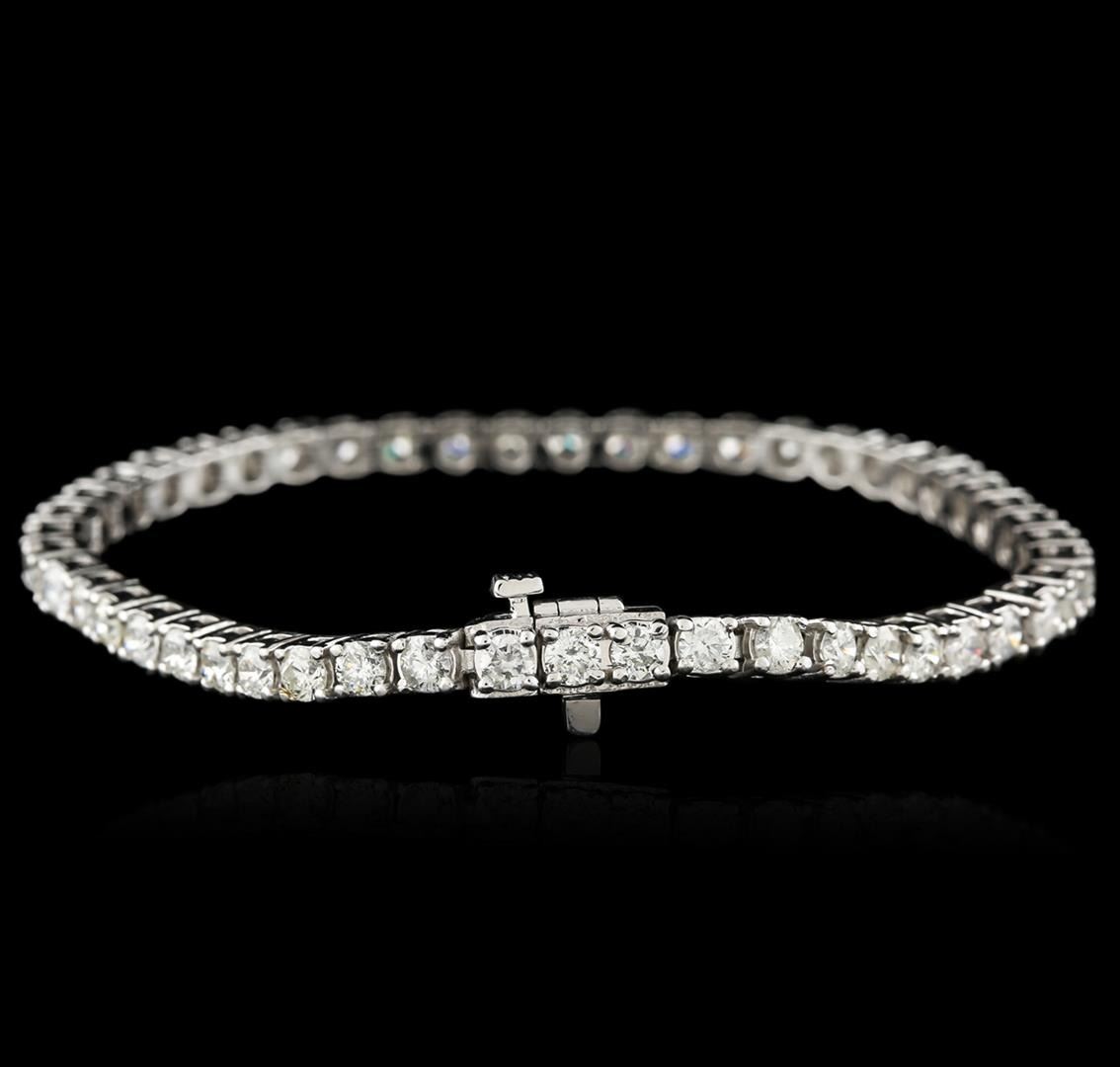 One electronically tested 14KT white gold ladies cast diamond tennis bracelet with a hidden box clasp with safety closer with a bright polish finish. Measurements: 7". Identified with markings of "14K". Condition is new. Containing: Forty-Nine prong set round brilliant cut diamonds, measuring 3.10 - 3.10 x 1.86mm (depth est.) approximate total weight of 49 Stones = 5.73ct. Clarity: SI-2 to I-2. Color: G - H, Cut is Good. Diamonds are graded in the mounting, unless otherwise stated. Total Weight of Diamonds 5.73ct. Total Weight of Tennis Bracelet 14.60 grams. GGL Appraised at $11,385.00.