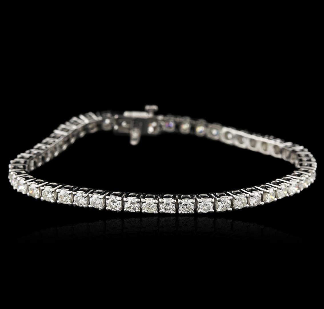 One electronically tested 14KT white gold ladies cast diamond tennis bracelet with a hidden box clasp with safety closer with a bright polish finish. Measurements: 7". Identified with markings of "14K". Condition is new. Containing: Forty-Nine prong set round brilliant cut diamonds, measuring 3.10 - 3.10 x 1.86mm (depth est.) approximate total weight of 49 Stones = 5.73ct. Clarity: SI-2 to I-2. Color: G - H, Cut is Good. Diamonds are graded in the mounting, unless otherwise stated. Total Weight of Diamonds 5.73ct. Total Weight of Tennis Bracelet 14.60 grams. GGL Appraised at $11,385.00.