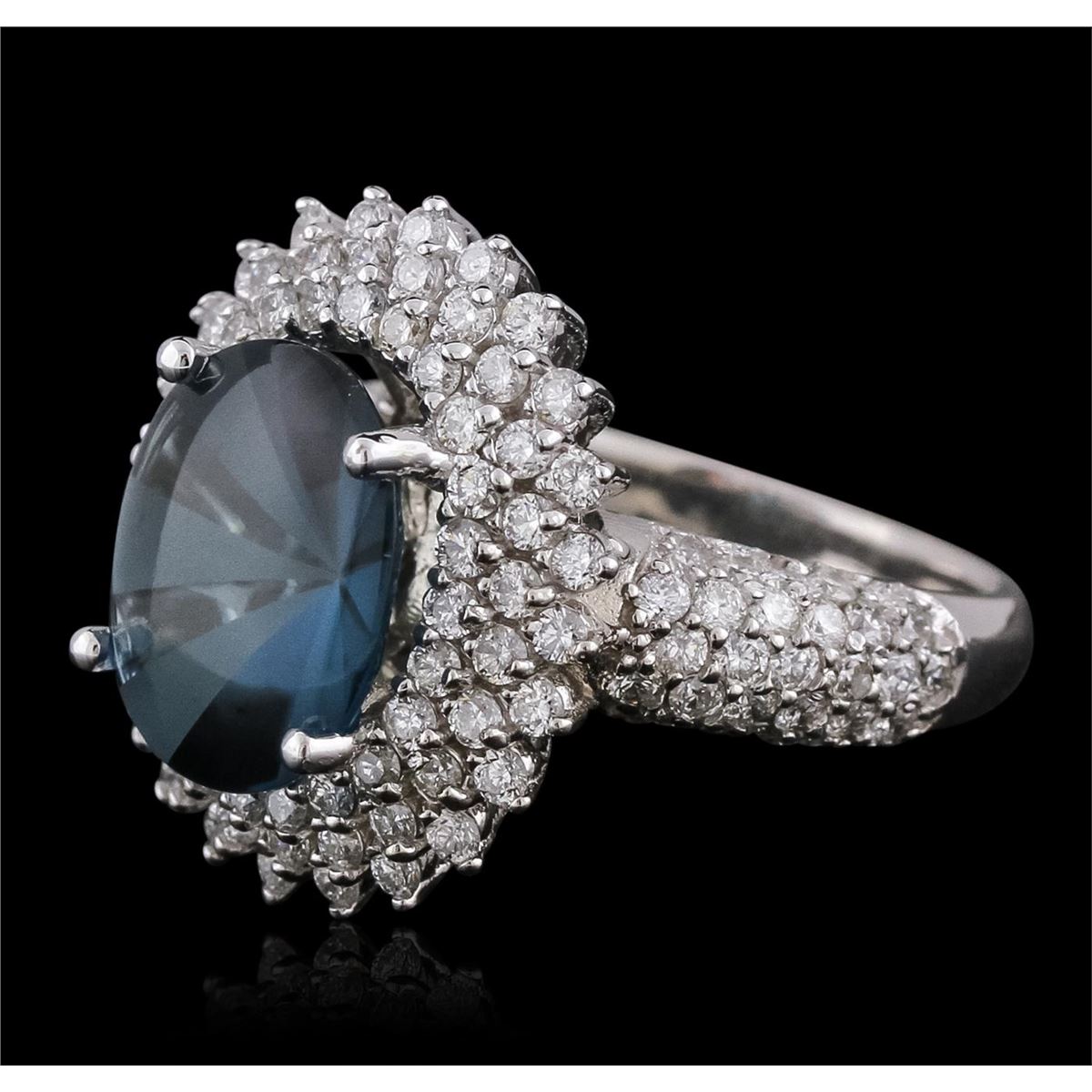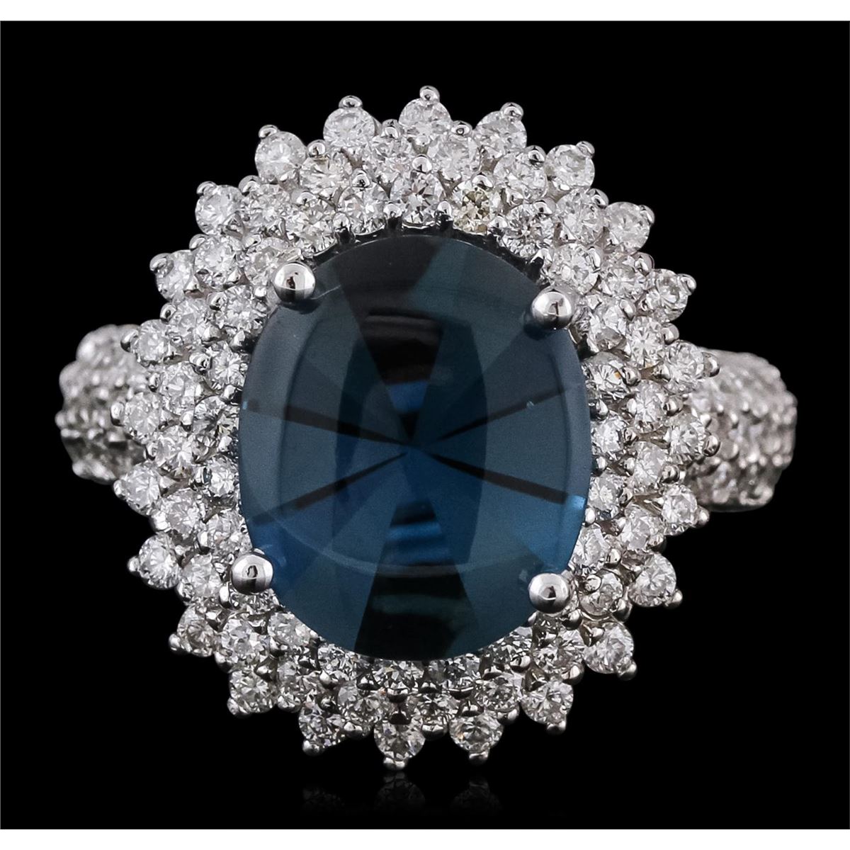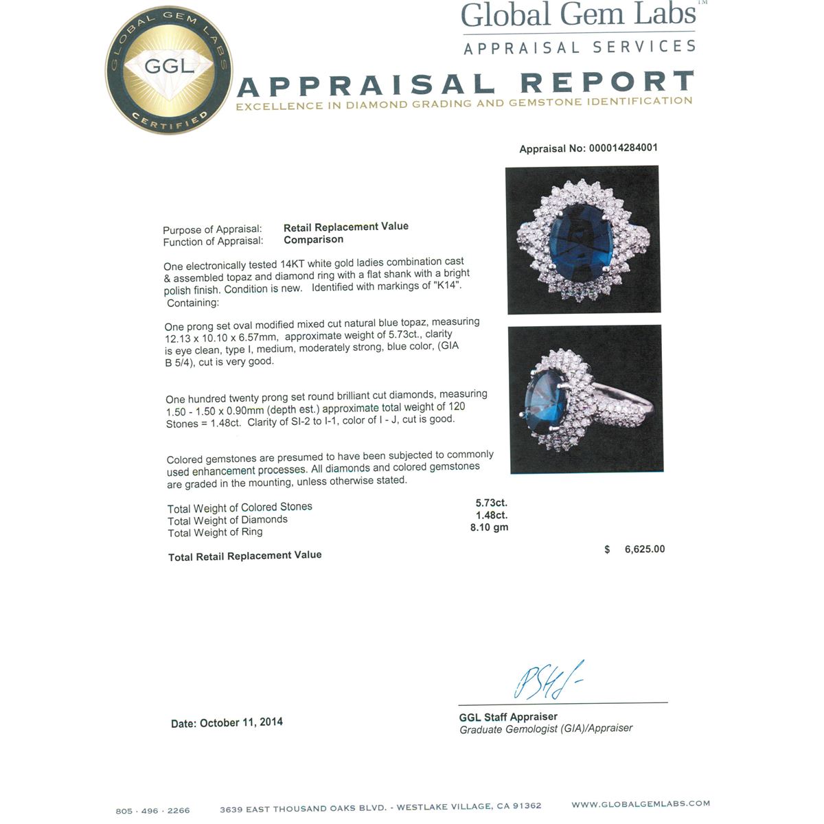 One electronically tested 14KT white gold ladies combination cast & assembled topaz and diamond ring with a flat shank with a bright polish finish. Identified with markings of "K14". Condition is new. Containing: One prong set oval modified mixed cut natural blue topaz, measuring 12.13 x 10.10 x 6.57mm, approximate weight of 5.73ct., clarity is eye clean, type I, medium, moderately strong, blue color, (GIA B 5/4), cut is very good. One Hundred Twenty prong set round brilliant cut diamonds, measuring 1.50 - 1.50 x 0.90mm (depth est.) approximate total weight of 120 Stones = 1.48ct. Clarity: SI-2 to I-1. Color: I - J, Cut is Good. Colored gemstones are presumed to have been subjected to commonly used enhancement processes. All diamonds and colored gemstones are graded in the mounting, unless otherwise stated. Total Weight of Colored Stones 5.73ct. Total Weight of Diamonds 1.48ct. Total Weight of Ring 8.10 grams. GGL Appraised at $6,625.00.