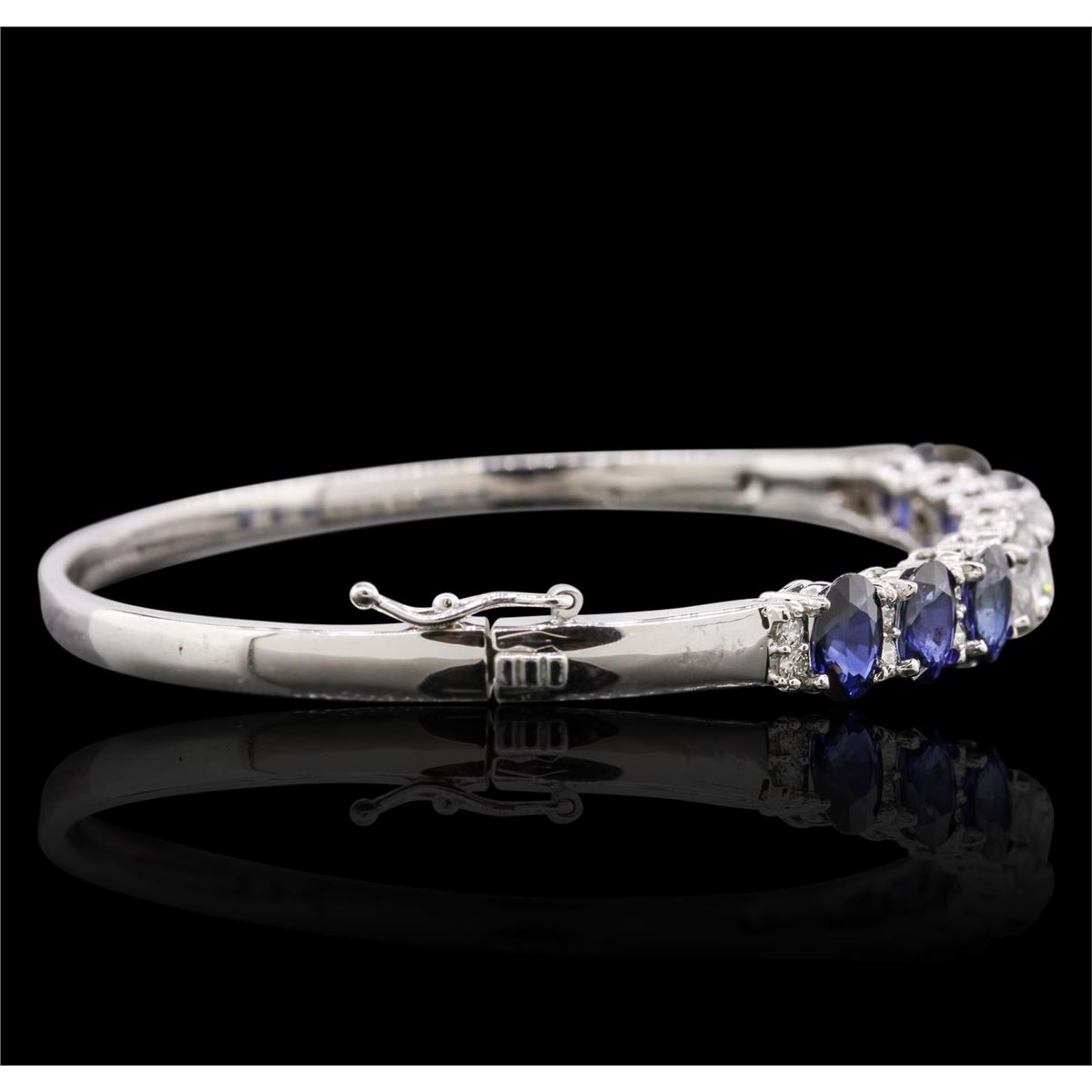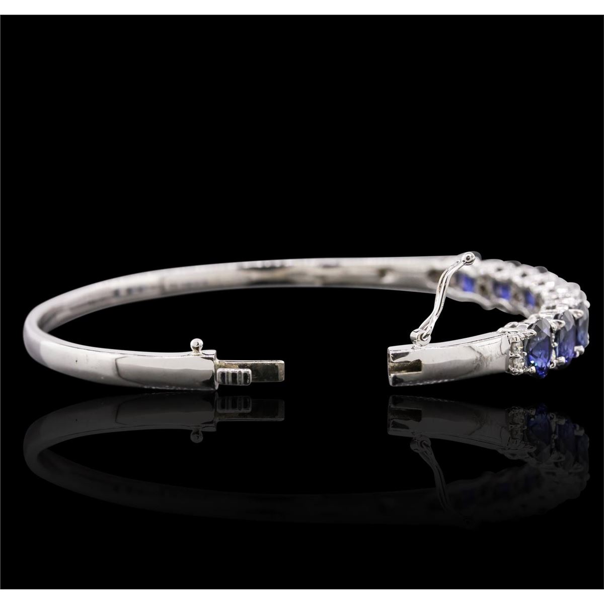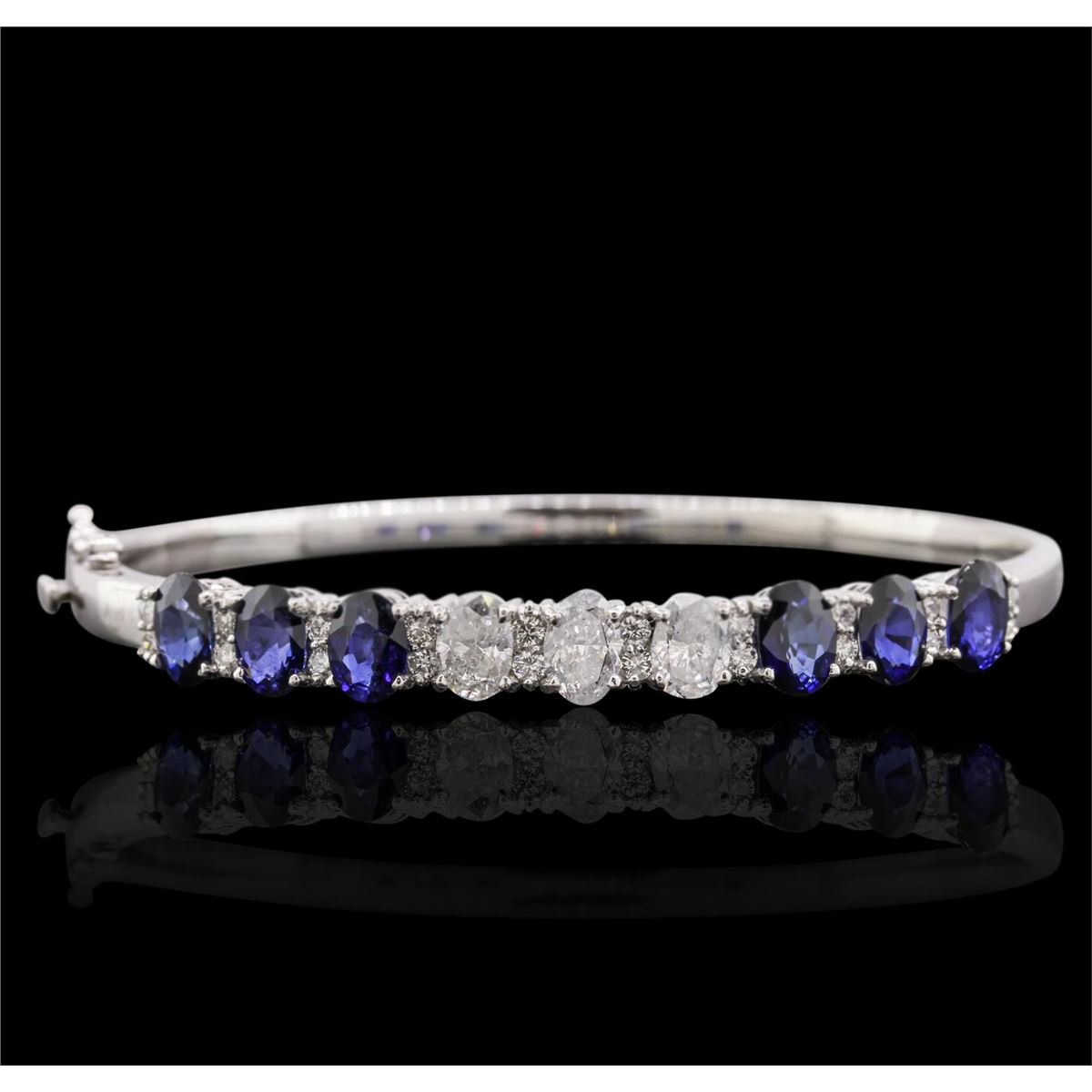 One electronically tested 14KT white gold ladies cast & assembled sapphire and diamond bangle bracelet with a bright polish finish. Condition is new, good workmanship. Seven inch length bangle bracelet features a sapphire and diamond ribbon supported by a hinged shoulder, terminating in a concealed clasp with safety. Identified with markings of "K14". Containing: Six prong set oval mixed cut natural blue sapphires, measuring 6.80 x 5.00. x 3.25mm, 6%. bulge factor, approximate. Total Weight of 5.76ct., clarity is slightly included, type II, dark, strong, violetish blue color, (GIA vB 7/5), cut is good. Transmitting light with a minimum of distortion, transparent, Naturally occurring internal & external characteristics are present. Intermittent color zoning present. Indications of laboratory high temperature diffusion treatment. Measurements & the color grade are an average for the group. Graded in the setting. Three prong set oval shaped cut diamonds, measuring 8.00. x 4.60 x 2.90mm (depth est.) approximate. Total Weight of 3 Stones = 2.24ct. Graded in the setting. Clarity: I-1 to I-2 . Color: H - I Twenty prong set round brilliant cut diamonds, measuring 2.00. - 1.80 x 1.14mm (depth est.) approximate. Total Weight of 20 Stones = 0.60ct. Graded in the setting. Clarity: SI-2 to I-2 . Color: G - I. Total Weight of Colored Stones 5.76ct.. Total Weight of Diamonds 2.84ct.. Total Weight of Bangle Bracelet 17.60gm. AIG Appraised at $17,540.00.