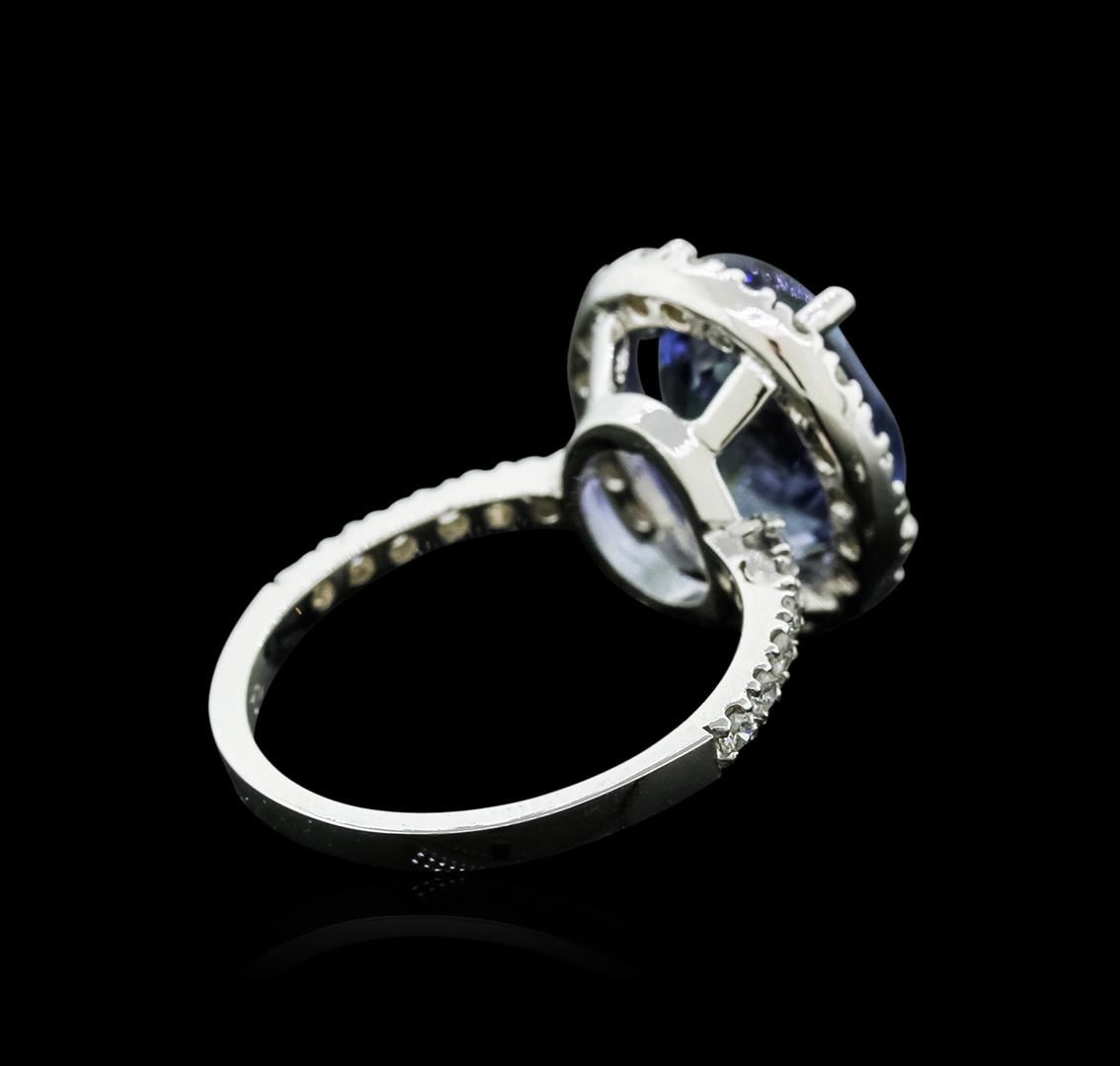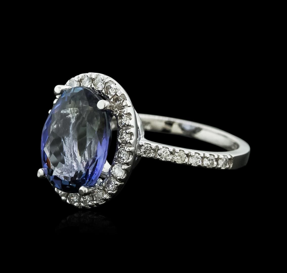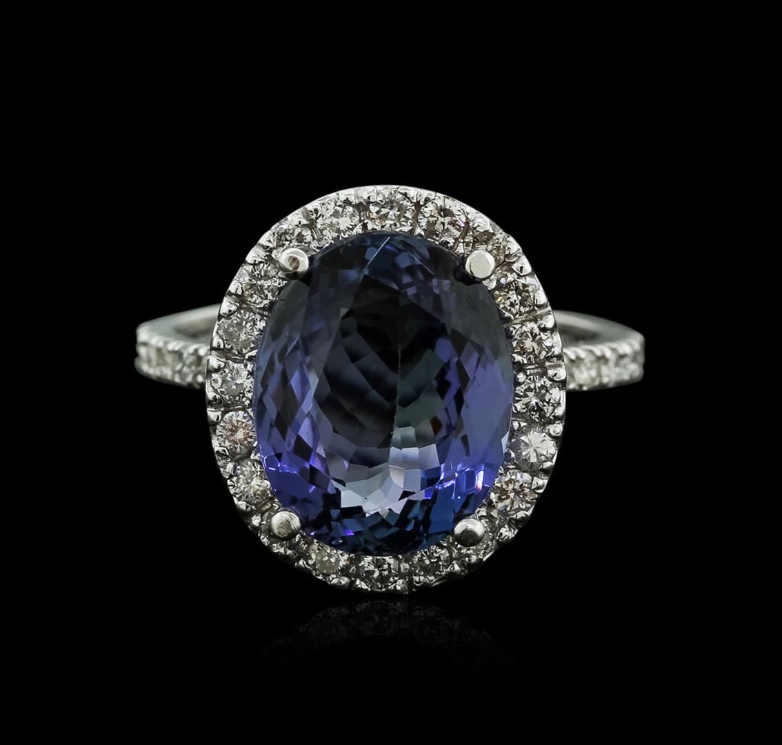 One polished, stamped, and tested 14K white gold ring mounted with: 1 genuine tanzanite center stone weighing 5.79 carat, and 30 genuine round diamonds weighing 0.60 carats. This item weighs 5.1 grams, condition is new, excellent workmanship. MAIN GEMSTONE: Species: Natural Zoisite. Variety: Tanzanite. Shape: Oval. Cutting Style: Brilliant Cut Crown Step Cut Pavilion. Measurements: 12.57 x 10.04 x 5.64 mm. Weight: 5.79 carat. Color: Violetish Blue. Cut Grade: Very Good. Refractive Index: 1.691 - 1.700 DR. Birefringence: 0.008 - 0.013. Hardness: 6.5 - 7. ADJACENT GEMSTONES ON RING: Identity: Natural Diamond. Shape: Round. Cutting Style: Brilliant Cut. Quantity: 30 Diamonds. Measurements: 1.5 - 1.7 mm. Total Weight: 0.60 carats. Clarity Grade: SI1 - SI2. Color Grade: G - H. Refractive Index: 2.418. Hardness: 10. Tanzanite Weight: 5.79 ct. Total Diamond Weight: 0.60 cts. Weight of Item: 5.1 grams. Gold Content: 14K White Gold. AIGL Appraised at $8,160.00.