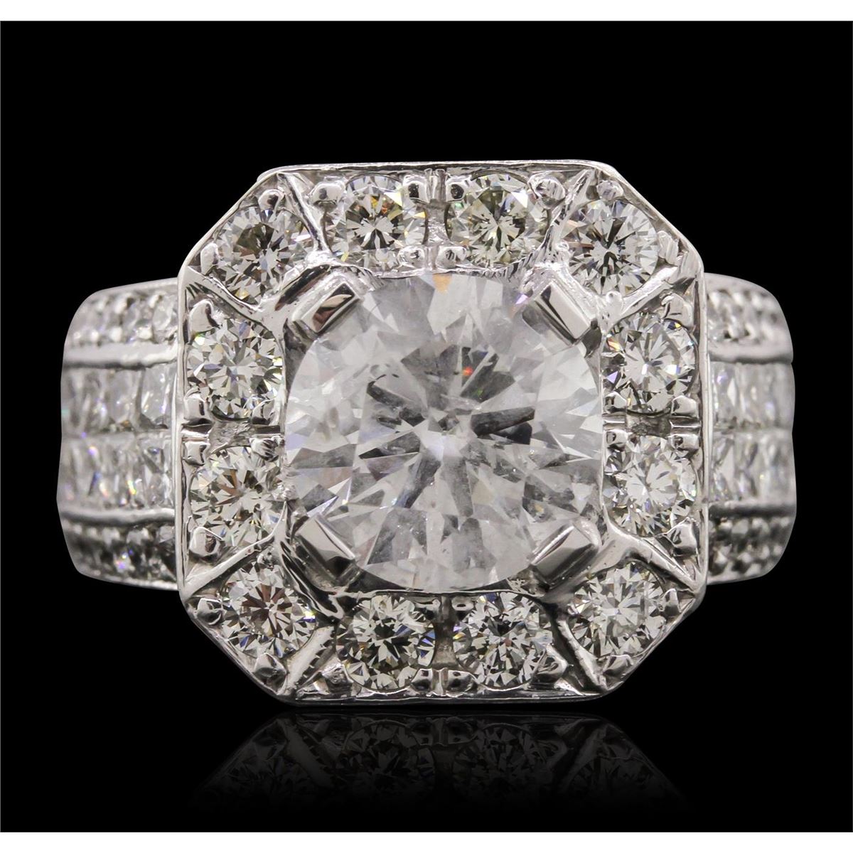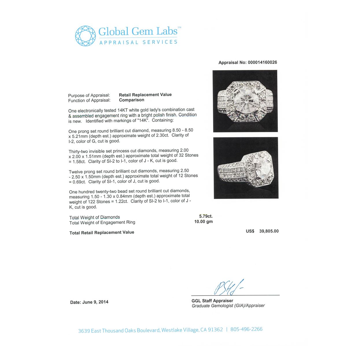 One electronically tested 14KT white gold Ladies combination cast & assembled engagement ring with a bright polish finish. Condition is new. Identified with markings of "14K". Containing: One prong set round brilliant cut diamond, measuring 8.50 - 8.50 x 5.21mm (depth est.) approximate weight of 2.30ct. Clarity: I-2. Color: G, Cut is Good. Thirty-Two invisible set princess cut diamonds, measuring 2.00 x 2.00 x 1.51mm (depth est.) approximate. Total Weight of 32 Stones = 1.58ct. Clarity: SI-2 to I-1. Color: J - K, Cut is Good. Twelve prong set round brilliant cut diamonds, measuring 2.50 - 2.50 x 1.50mm (depth est.) approximate. Total Weight of 12 Stones = 0.69ct. Clarity: SI-1. Color: J, Cut is Good. One Hundred Twenty-Two bead set round brilliant cut diamonds, measuring 1.50 - 1.30 x 0.84mm (depth est.) approximate. Total Weight of 122 Stones = 1.22ct. Clarity: SI-2 to I-1. Color: J - K, Cut is Good. Total Weight of Diamonds 5.79ct. Total Weight of Engagement Ring 10.00 grams. GGL Appraised at $39,805.00.
