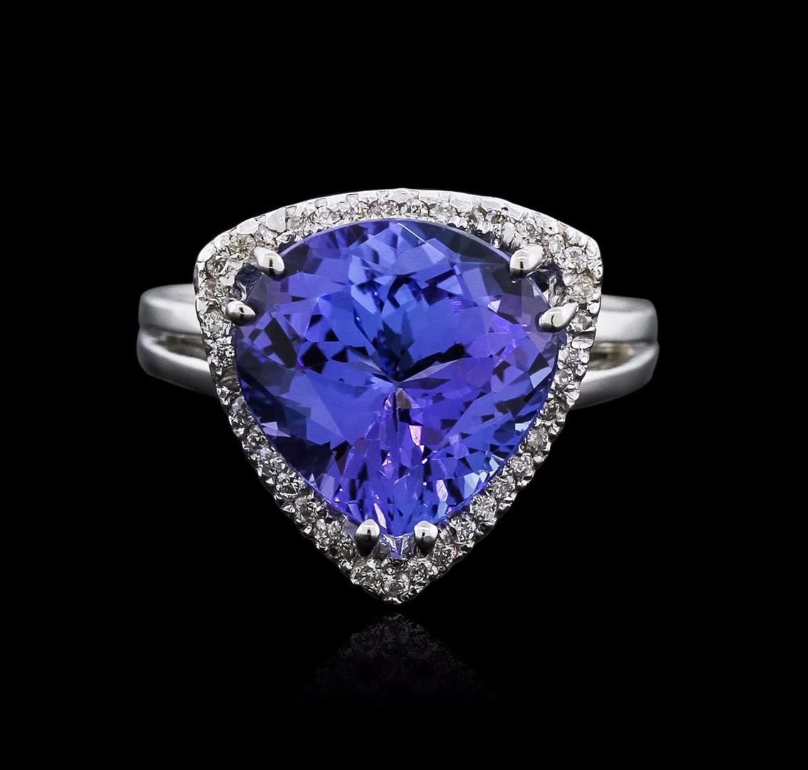 One electronically tested 14KT white gold ladies cast tanzanite and diamond ring with a bright polish finish. Identified with markings of "14K". Condition is new. Containing: One prong set pear modified brilliant cut natural tanzanite, measuring 11.00. x 11.00. x 7.16mm, approximate weight of 5.80ct., clarity is eye clean, type I, medium light, very slightly grayish, violet color, (GIA V 4/3), cut is good. Thirty-Nine prong set round brilliant cut diamonds, measuring 1.30 - 1.30 x 0.78mm (depth est.) approximate total weight of 39 Stones = 0.31ct. Clarity: I-1 to I-2. Color: I - J. All diamonds and colored gemstones are graded in the mounting, unless otherwise stated. Colored gemstones are presumed to have been subjected to commonly used enhancement processes. Total Weight of Colored Stones 5.80ct. Total Weight of Diamonds 0.31ct. Total Weight of Ring 4.50 grams. GGL Appraised at $4,990.00.