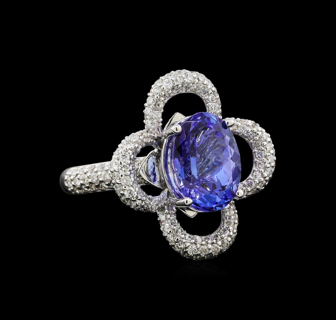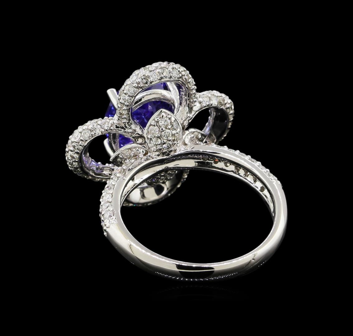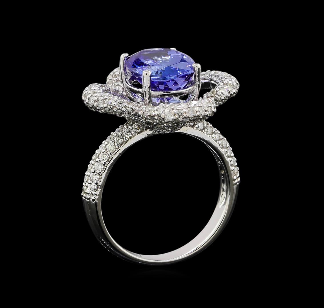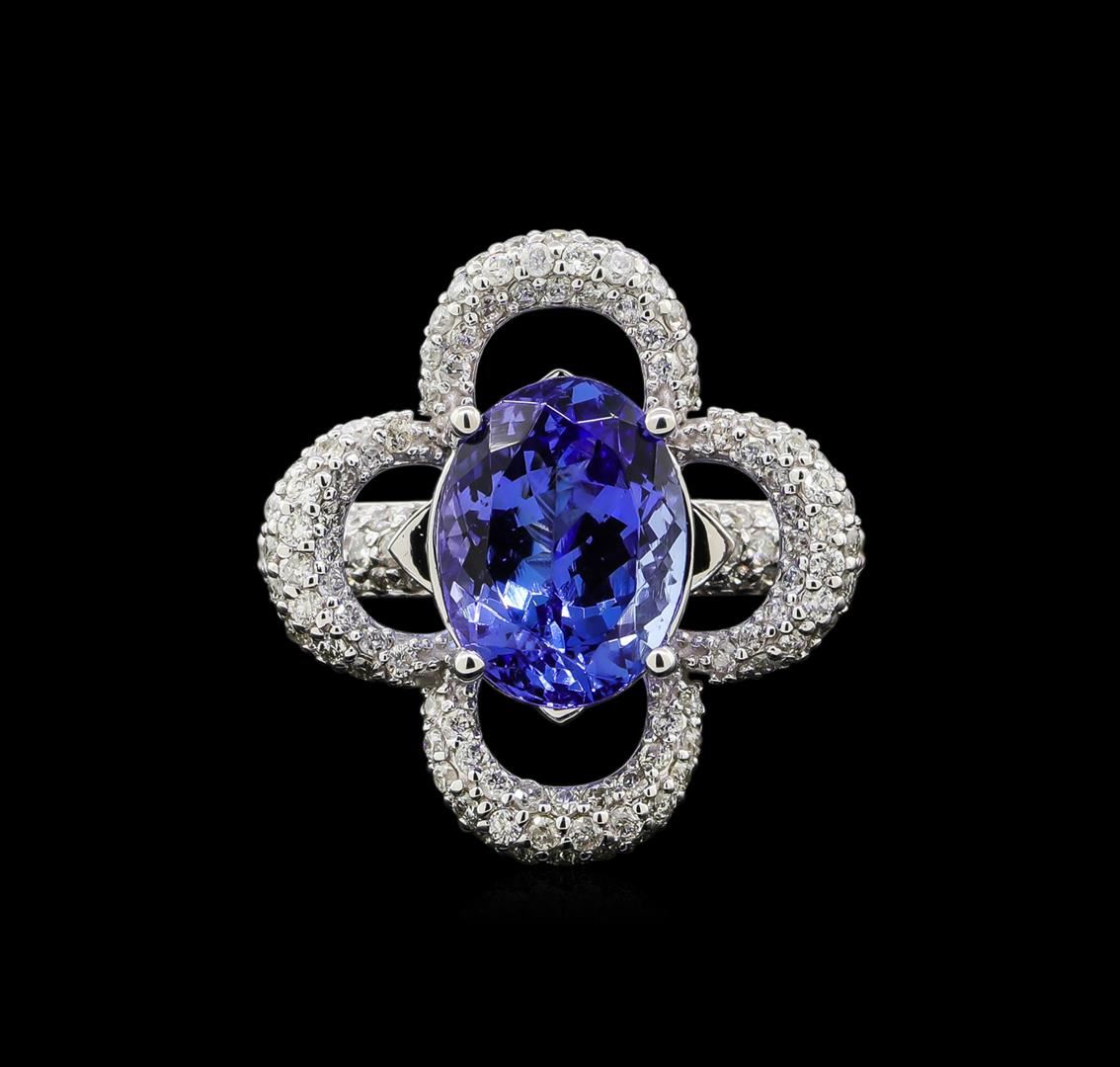 One electronically tested 14KT white gold ladies cast tanzanite and diamond ring with a bright polish finish. Identified with markings of "14K". Condition is new. Containing: One prong set emerald standard step cut natural tanzanite, measuring 11.10 x 8.20 x 7.06mm, approximate weight of 5.81ct., clarity is eye clean, type I, medium light, very slightly grayish, violet color, (GIA V 4/3), cut is good. One Hundred Seventy-Six prong set round brilliant cut diamonds, measuring 1.30 - 1.30 x 0.78mm (depth est.) approximate total weight of 176 Stones = 1.41ct. Clarity of SI-2 to I-2, Color of I - J, Cut is Good. Colored gemstones are presumed to have been subjected to commonly used enhancement processes. All diamonds and colored gemstones are graded in the mounting, unless otherwise stated. Total Weight of Colored Stones 5.81ct. Total Weight of Diamonds 1.41ct. Total Weight of Ring 7.20 grams. GGL Appraised at $7,665.00.