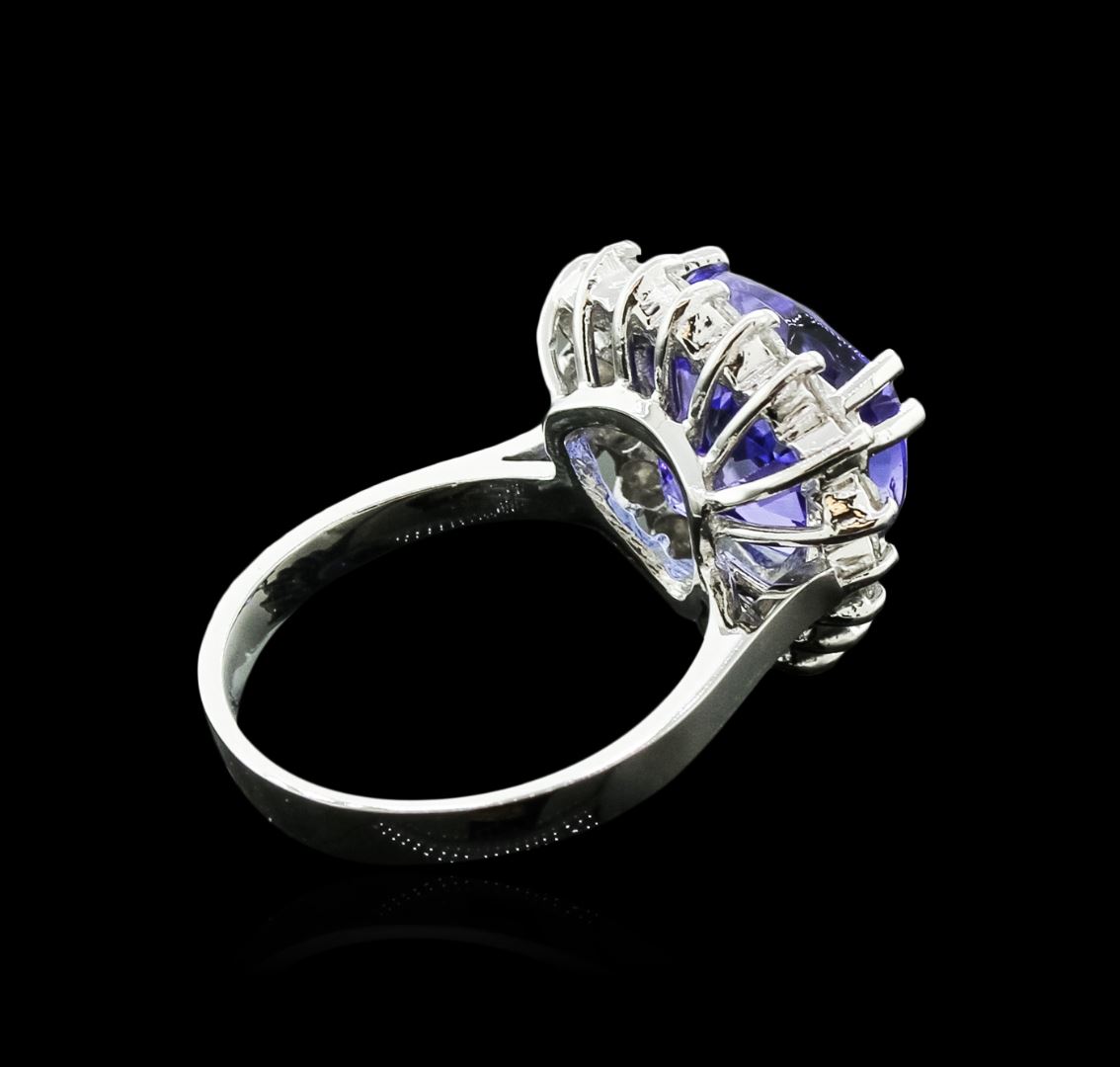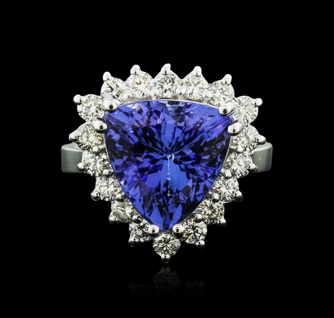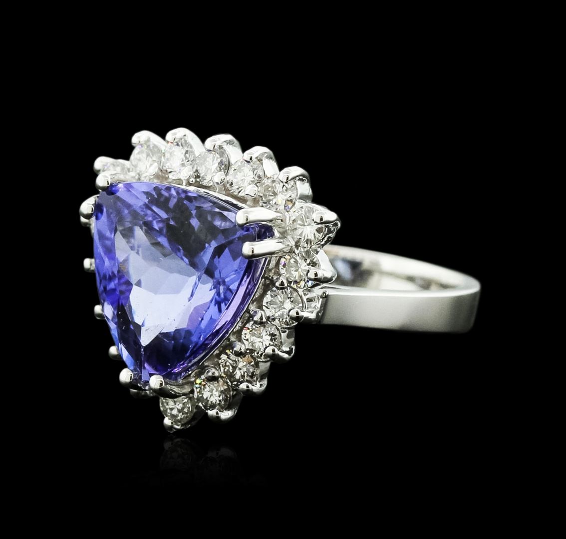 One electronically tested 14KT white gold ladies cast tanzanite and diamond ring with a bright polish finish. Identified with markings of "14K". Condition is new. Containing: One prong set triangle modified brilliant cut natural tanzanite, measuring 11.40 x 11.40 x 7.41mm, approximate weight of 5.81ct., clarity is eye clean, type I, medium, moderately strong, violetish blue color, (GIA vB 5/4), cut is good. Eighteen prong set round brilliant cut diamonds, measuring 2.40 - 2.40 x 1.44mm (depth est.) approximate total weight of 18 Stones = 0.91ct. . Clarity: SI-1 to SI-2. Color: I - J, Cut is Good. Colored gemstones are presumed to have been subjected to commonly used enhancement processes. All diamonds and colored gemstones are graded in the mounting, unless otherwise stated.. Total Weight of Colored Stones 5.81ct.. Total Weight of Diamonds 0.91ct.. Total Weight of Ring 6.40 grams. GGL Appraised at $5,795.00.