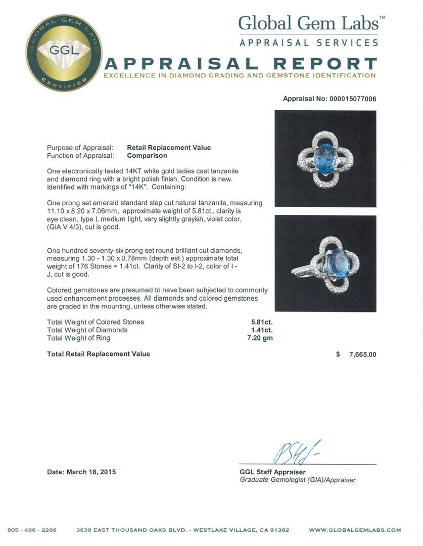 One electronically tested 14KT white gold ladies cast tanzanite and diamond ring with a bright polish finish. Identified with markings of "14K". Condition is new. Containing: One prong set emerald standard step cut natural tanzanite, measuring 11.10 x 8.20 x 7.06mm, approximate weight of 5.81ct., clarity is eye clean, type I, medium light, very slightly grayish, violet color, (GIA V 4/3), cut is good. One Hundred Seventy-Six prong set round brilliant cut diamonds, measuring 1.30 - 1.30 x 0.78mm (depth est.) approximate total weight of 176 Stones = 1.41ct. Clarity of SI-2 to I-2, Color of I - J, Cut is Good. Colored gemstones are presumed to have been subjected to commonly used enhancement processes. All diamonds and colored gemstones are graded in the mounting, unless otherwise stated. Total Weight of Colored Stones 5.81ct. Total Weight of Diamonds 1.41ct. Total Weight of Ring 7.20 grams. GGL Appraised at $7,665.00.