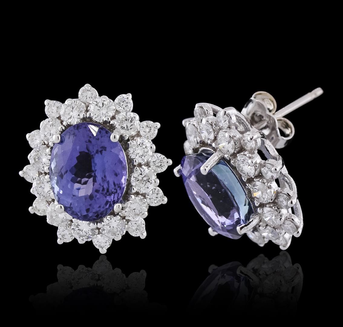 One pair electronically tested 14KT white gold ladies combination cast & assembled stud earrings with friction posts with a bright polish finish. Identified with markings of "14K". Condition is new. Containing: Two prong set oval modified brilliant cut natural tanzanites, measuring 9.51 x 7.72 x 5.86mm, approximate total weight of 5.82ct., clarity is eye clean, type I, medium light, very slightly grayish, bluish violet color, (GIA bV 4/3), cut is good. Twenty-Four prong set round brilliant cut diamonds, measuring 2.50 - 2.50 x 1.50mm (depth est.) approximate total weight of 24 Stones = 1.37ct. Clarity: SI-2 to I-1. Color: J - K, Cut is Good. Twenty-Four prong set round brilliant cut diamonds, measuring 1.80 - 1.80 x 1.08mm (depth est.) approximate total weight of 24 Stones = 0.51ct. Clarity: SI-2 to I-1. Color: I - K, Cut is Good. Colored gemstones are presumed to have been subjected to commonly used enhancement processes. All diamonds and colored gemstones are graded in the mounting, unless otherwise stated. Total Weight of Colored Stones 5.82ct. Total Weight of Diamonds 1.88ct. Total Weight of Earrings 6.40 grams. GGL Appraised at $13,515.00.
