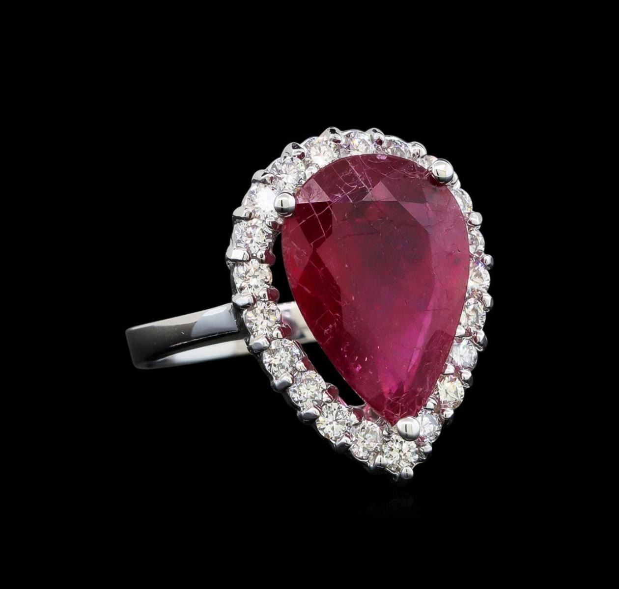 One electronically tested 14KT white gold ladies cast ruby and diamond ring with a bright polish finish. Identified with markings of "14K". Condition is new. Containing: One prong set pear modified brilliant cut natural ruby, measuring 15.00. x 10.00. x 4.90mm, approximate weight of 5.88ct., clarity is heavily included, type II, medium dark, moderately strong, strongly purplish red color, (GIA stpR 6/4), cut is good. Twenty-One prong set round brilliant cut diamonds, measuring 1.90 - 1.90 x 1.14mm (depth est.) approximate total weight of 21 Stones = 0.53ct. Clarity: SI-1 to SI-2. Color: I - J. All diamonds and colored gemstones are graded in the mounting, unless otherwise stated. Colored gemstones are presumed to have been subjected to commonly used enhancement processes. Total Weight of Colored Stones 5.88ct. Total Weight of Diamonds 0.53ct. Total Weight of Ring 6.80 grams. GGL Appraised.
