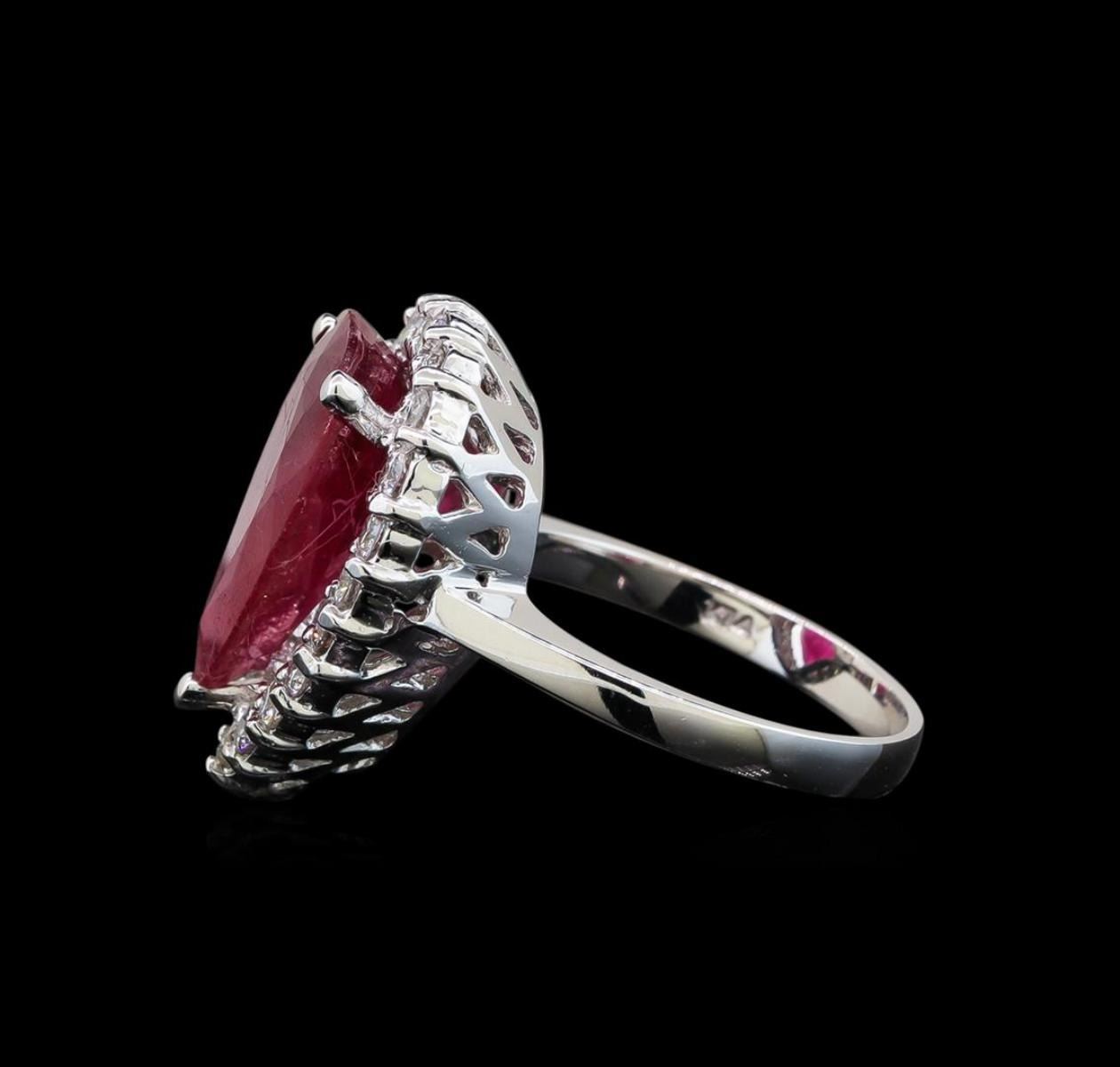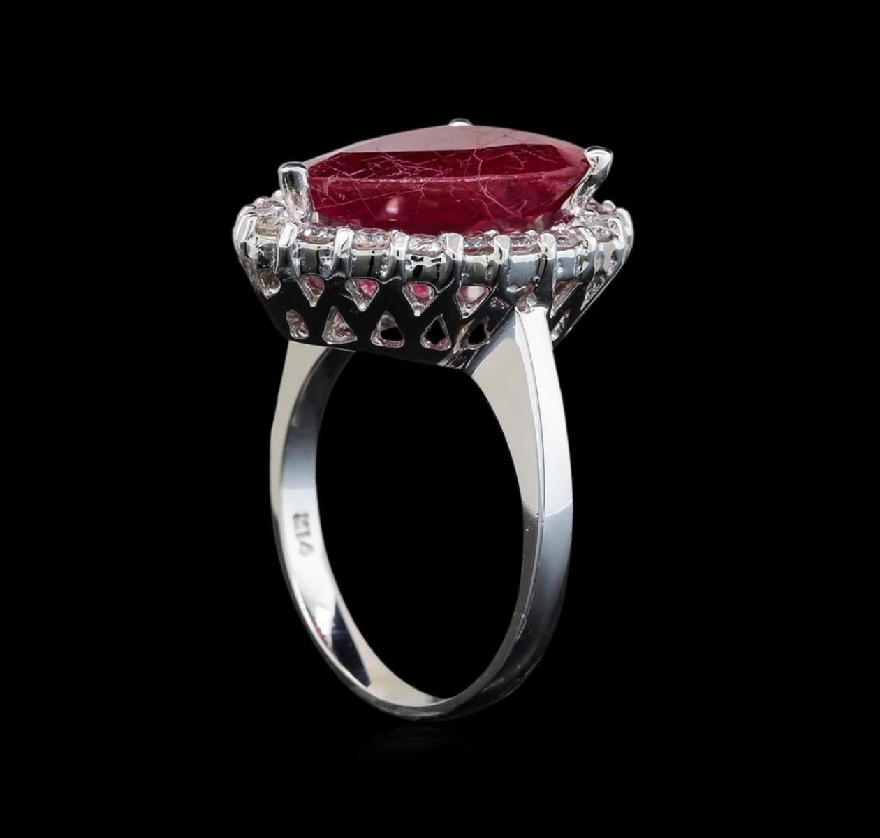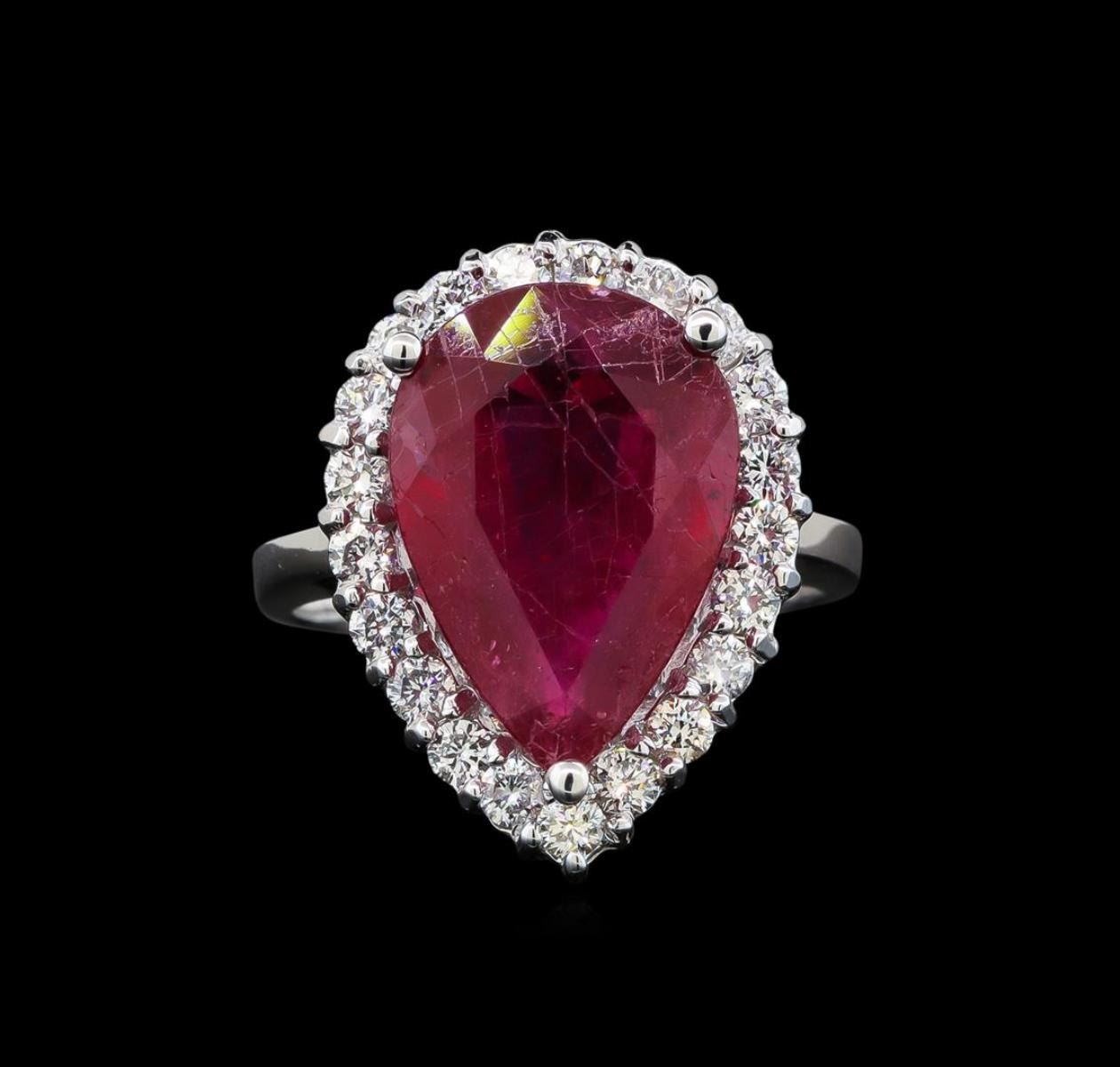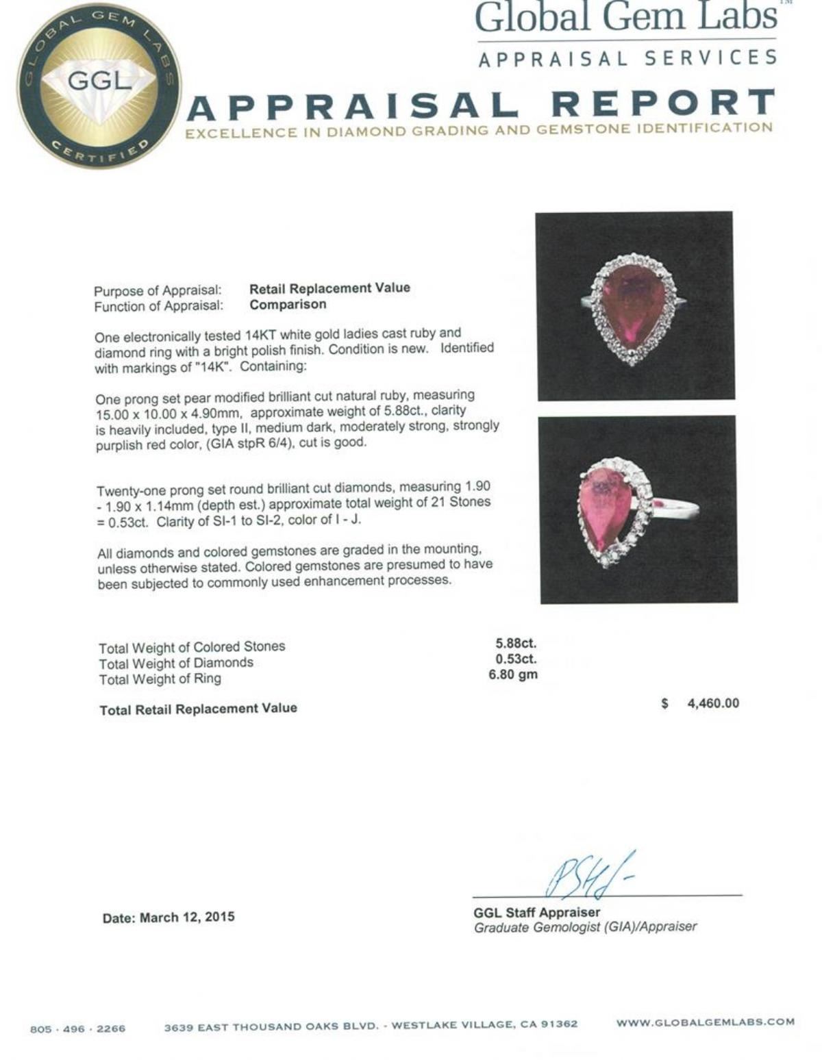 One electronically tested 14KT white gold ladies cast ruby and diamond ring with a bright polish finish. Identified with markings of "14K". Condition is new. Containing: One prong set pear modified brilliant cut natural ruby, measuring 15.00. x 10.00. x 4.90mm, approximate weight of 5.88ct., clarity is heavily included, type II, medium dark, moderately strong, strongly purplish red color, (GIA stpR 6/4), cut is good. Twenty-One prong set round brilliant cut diamonds, measuring 1.90 - 1.90 x 1.14mm (depth est.) approximate total weight of 21 Stones = 0.53ct. Clarity: SI-1 to SI-2. Color: I - J. All diamonds and colored gemstones are graded in the mounting, unless otherwise stated. Colored gemstones are presumed to have been subjected to commonly used enhancement processes. Total Weight of Colored Stones 5.88ct. Total Weight of Diamonds 0.53ct. Total Weight of Ring 6.80 grams. GGL Appraised.