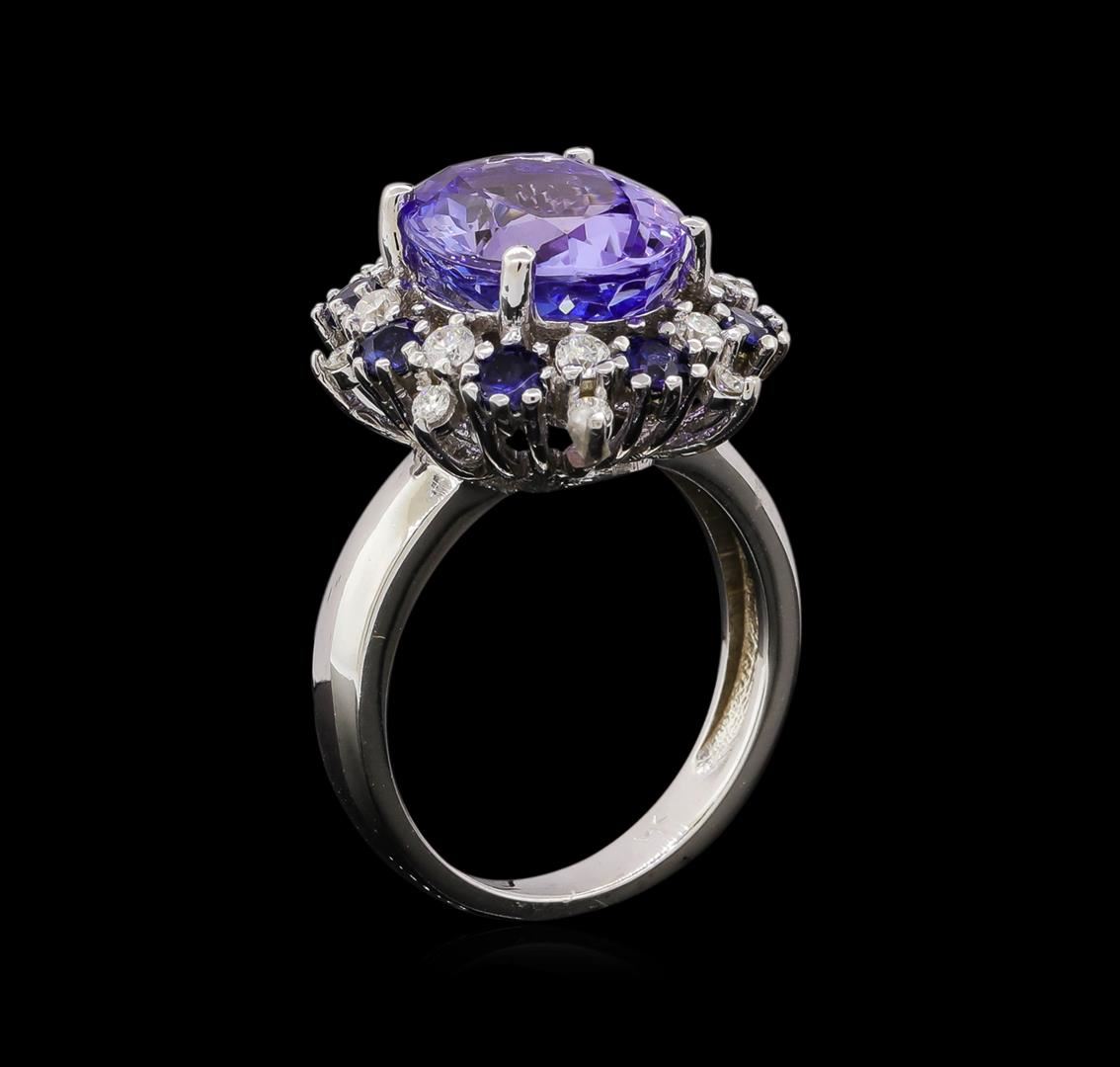One electronically tested 14KT white gold ladies cast tanzanite, sapphire and diamond ring with a bright polish finish. Identified with markings of "14K". Condition is new. Containing: One prong set oval modified brilliant cut natural tanzanite, measuring 12.60 x 10.10 x 6.57mm, approximate weight of 5.88ct., clarity is eye clean, type I, medium light, slightly grayish, violet color, (GIA V 4/2), cut is good. Eight prong set round modified brilliant cut natural blue sapphires, measuring 2.60 - 2.60 x 1.69 mm, approximate total weight of 0.72ct., clarity is slightly included, type II, medium, moderately strong, blue color, (GIA B 5/4), cut is good. Sixteen prong set round brilliant cut diamonds, measuring 1.90 - 1.50 x 1.02mm (depth est.) approximate total weight of 16 Stones = 0.29ct. Clarity: SI-1 to I-1. Color: I - J, Cut is Good. Colored gemstones are presumed to have been subjected to commonly used enhancement processes. All diamonds and colored gemstones are graded in the mounting, unless otherwise stated. Total Weight of Colored Stones 6.60ct. Total Weight of Diamonds 0.29ct. Total Weight of Ring 8.10 grams. GGL Appraised at $5,415.00.