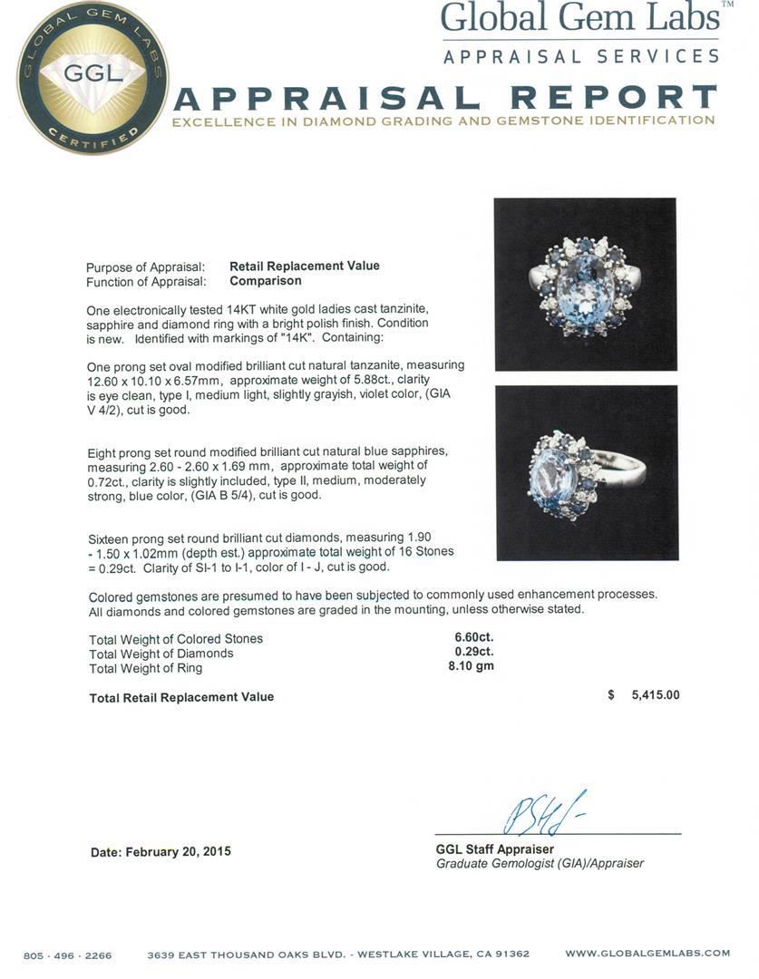One electronically tested 14KT white gold ladies cast tanzanite, sapphire and diamond ring with a bright polish finish. Identified with markings of "14K". Condition is new. Containing: One prong set oval modified brilliant cut natural tanzanite, measuring 12.60 x 10.10 x 6.57mm, approximate weight of 5.88ct., clarity is eye clean, type I, medium light, slightly grayish, violet color, (GIA V 4/2), cut is good. Eight prong set round modified brilliant cut natural blue sapphires, measuring 2.60 - 2.60 x 1.69 mm, approximate total weight of 0.72ct., clarity is slightly included, type II, medium, moderately strong, blue color, (GIA B 5/4), cut is good. Sixteen prong set round brilliant cut diamonds, measuring 1.90 - 1.50 x 1.02mm (depth est.) approximate total weight of 16 Stones = 0.29ct. Clarity: SI-1 to I-1. Color: I - J, Cut is Good. Colored gemstones are presumed to have been subjected to commonly used enhancement processes. All diamonds and colored gemstones are graded in the mounting, unless otherwise stated. Total Weight of Colored Stones 6.60 ct. Total Weight of Diamonds 0.29ct. Total Weight of Ring 8.10 grams. GGL Appraised.