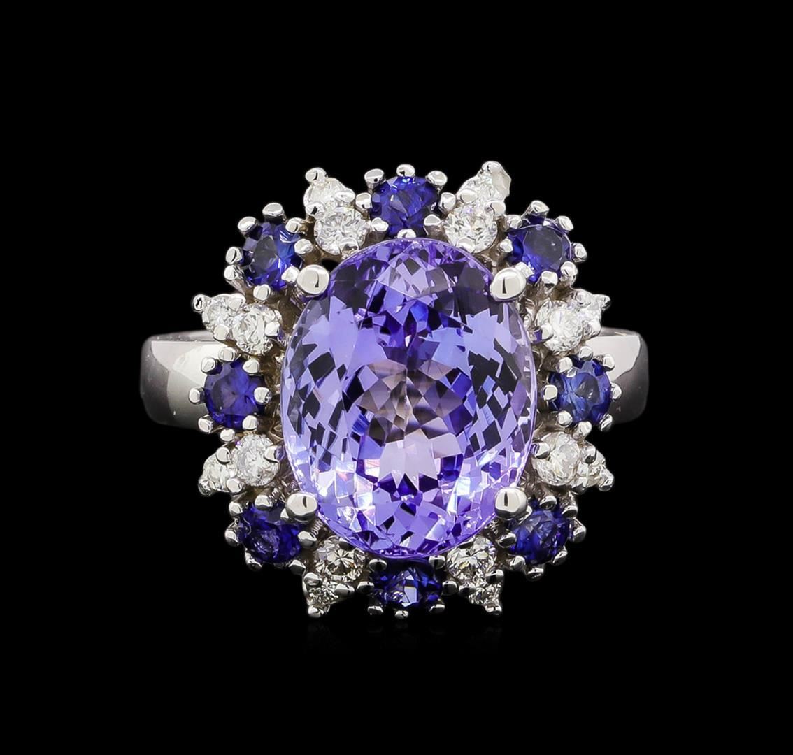 One electronically tested 14KT white gold ladies cast tanzanite, sapphire and diamond ring with a bright polish finish. Identified with markings of "14K". Condition is new. Containing: One prong set oval modified brilliant cut natural tanzanite, measuring 12.60 x 10.10 x 6.57mm, approximate weight of 5.88ct., clarity is eye clean, type I, medium light, slightly grayish, violet color, (GIA V 4/2), cut is good. Eight prong set round modified brilliant cut natural blue sapphires, measuring 2.60 - 2.60 x 1.69 mm, approximate total weight of 0.72ct., clarity is slightly included, type II, medium, moderately strong, blue color, (GIA B 5/4), cut is good. Sixteen prong set round brilliant cut diamonds, measuring 1.90 - 1.50 x 1.02mm (depth est.) approximate total weight of 16 Stones = 0.29ct. Clarity: SI-1 to I-1. Color: I - J, Cut is Good. Colored gemstones are presumed to have been subjected to commonly used enhancement processes. All diamonds and colored gemstones are graded in the mounting, unless otherwise stated. Total Weight of Colored Stones 6.60 ct. Total Weight of Diamonds 0.29ct. Total Weight of Ring 8.10 grams. GGL Appraised.