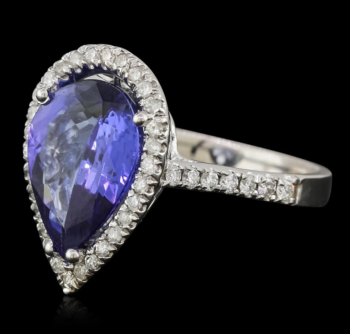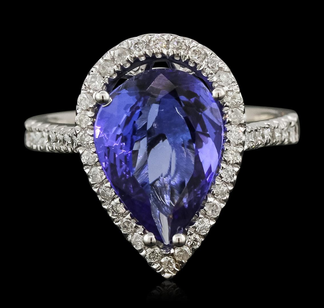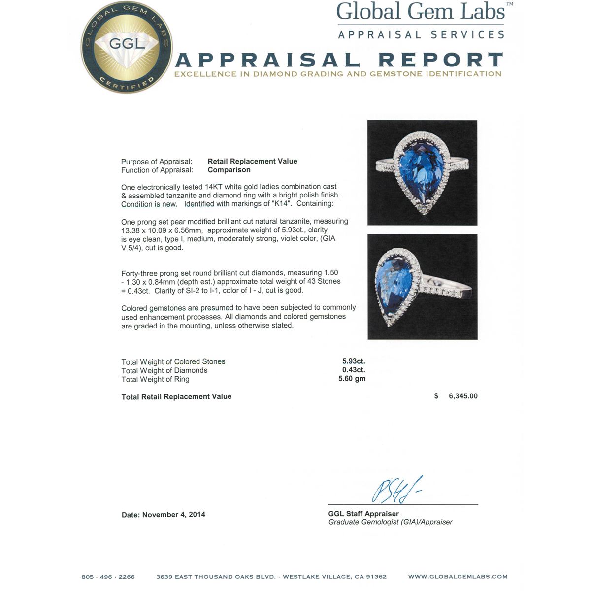 One electronically tested 14KT white gold ladies combination cast & assembled tanzanite and diamond ring with a bright polish finish. Identified with markings of "K14". Condition is new. Containing: One prong set pear modified brilliant cut natural tanzanite, measuring 13.38 x 10.09 x 6.56mm, approximate weight of 5.93ct., clarity is eye clean, type I, medium, moderately strong, violet color, (GIA V 5/4), cut is good. Forty-Three prong set round brilliant cut diamonds, measuring 1.50 - 1.30 x 0.84mm (depth est.) approximate total weight of 43 Stones = 0.43ct. Clarity: SI-2 to I-1. Color: I - J, Cut is Good. Colored gemstones are presumed to have been subjected to commonly used enhancement processes. All diamonds and colored gemstones are graded in the mounting, unless otherwise stated. Total Weight of Colored Stones 5.93ct. Total Weight of Diamonds 0.43ct. Total Weight of Ring 5.60 grams. GGL Appraised at $6,345.00.