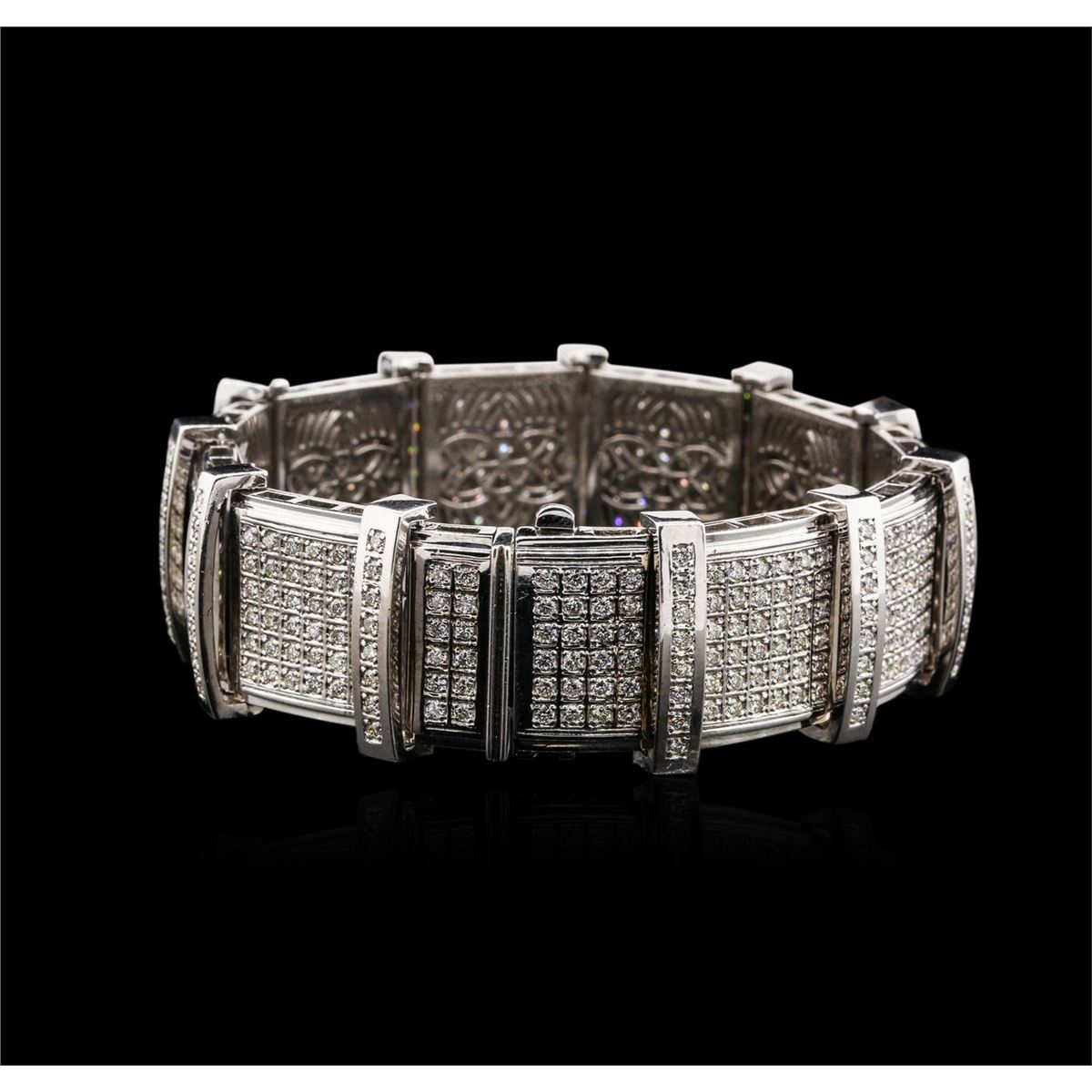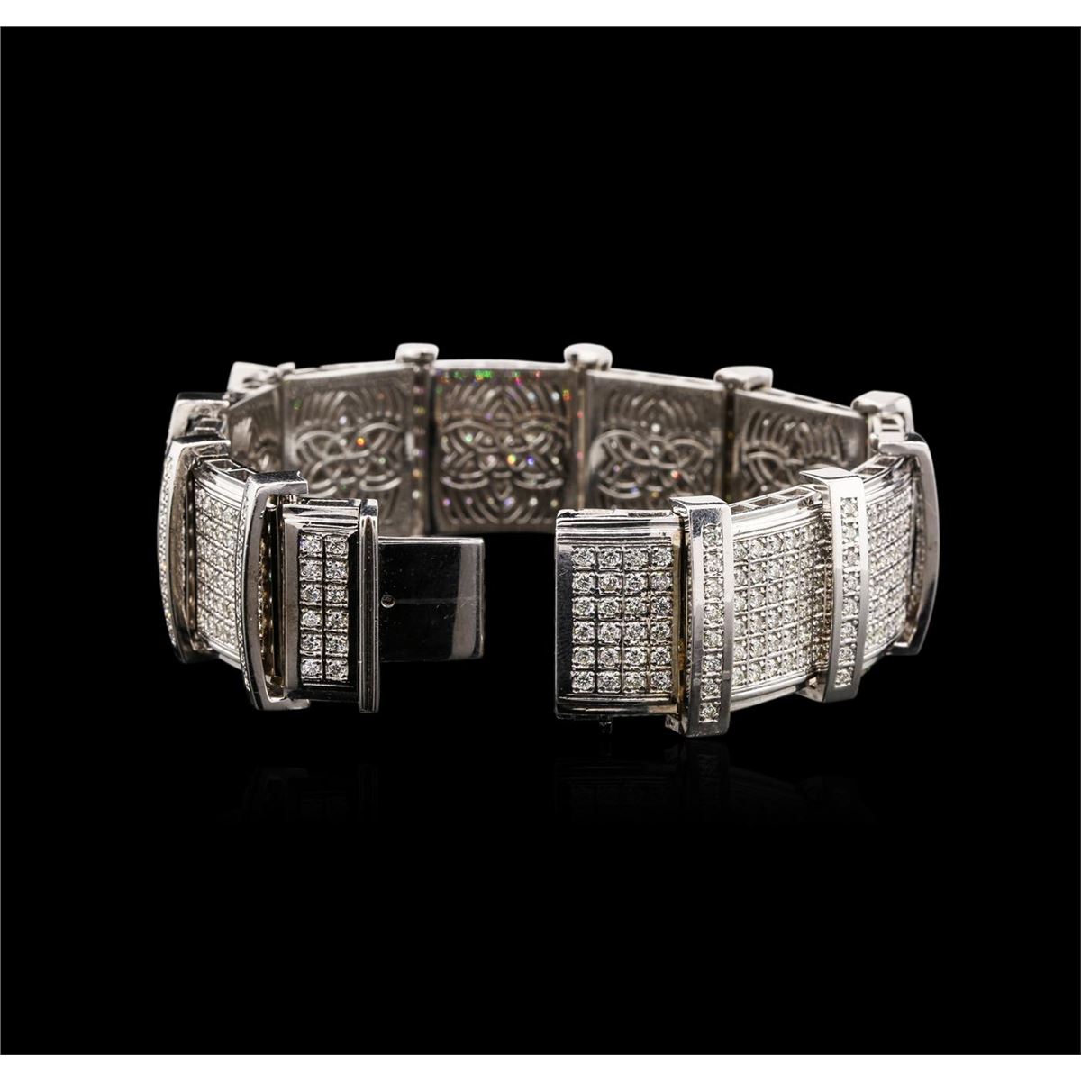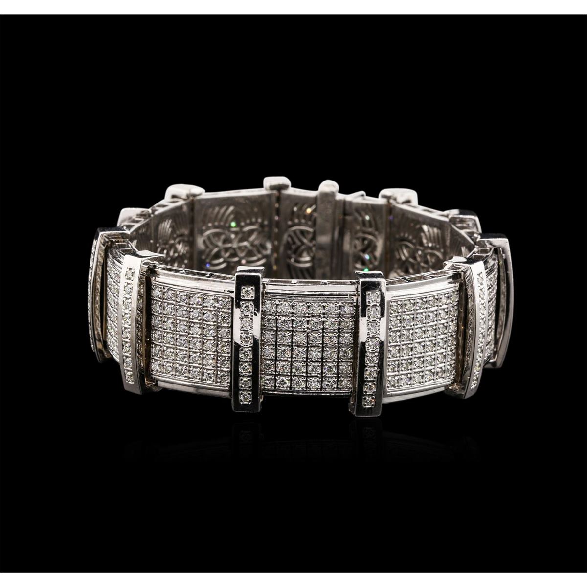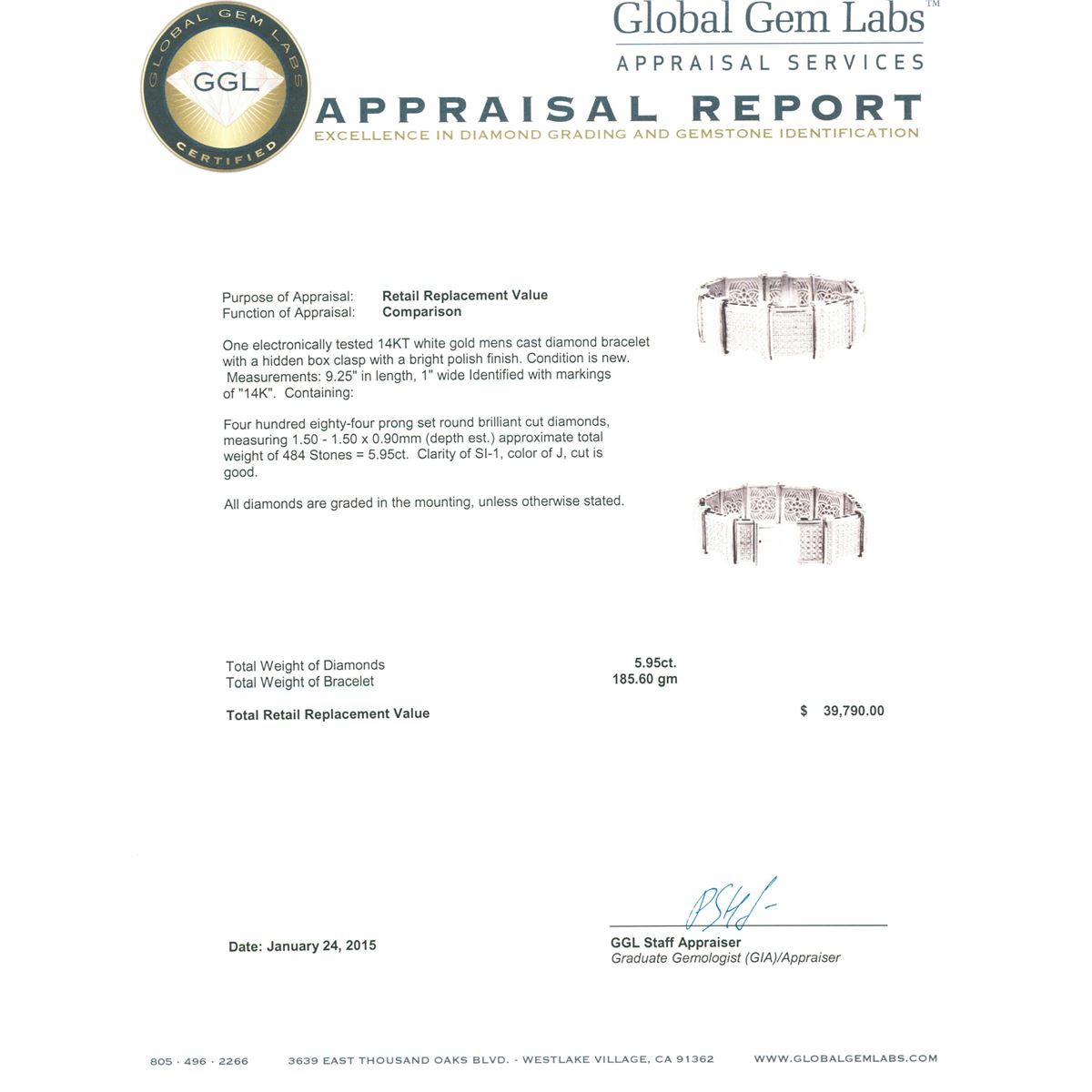 One electronically tested 14KT white gold mens cast diamond bracelet with a hidden box clasp with a bright polish finish. Measurements: 9.25" in length, 1" wide Identified with markings of "14K". Condition is new. Containing: Four Hundred Eighty-Four prong set round brilliant cut diamonds, measuring 1.50 - 1.50 x 0.90mm (depth est.) approximate total weight of 484 Stones = 5.95ct. Clarity: SI-1. Color: J, Cut is Good. All diamonds are graded in the mounting, unless otherwise stated. Total Weight of Diamonds 5.95ct. Total Weight of Bracelet 185.60 grams. GGL Appraised at $39,790.00.