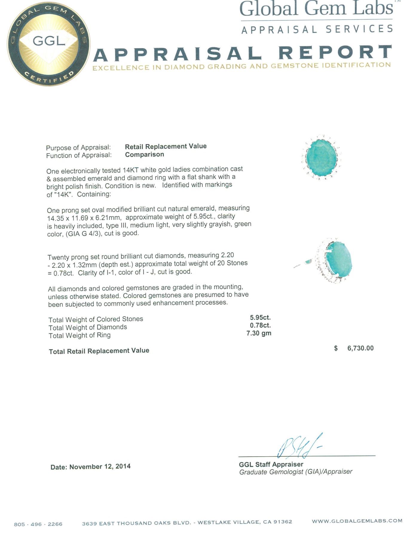 One electronically tested 14KT white gold ladies combination cast & assembled emerald and diamond ring with a flat shank with a bright polish finish. Identified with markings of "14K". Condition is new. Containing: One prong set oval modified brilliant cut natural emerald, measuring 14.35 x 11.69 x 6.21mm, approximate weight of 5.95ct., clarity is heavily included, type III, medium light, very slightly grayish, green color, (GIA G 4/3), cut is good. Twenty prong set round brilliant cut diamonds, measuring 2.20 - 2.20 x 1.32mm (depth est.) approximate total weight of 20 Stones = 0.78ct. Clarity: I-1. Color: I - J, Cut is Good. All diamonds and colored gemstones are graded in the mounting, unless otherwise stated. Colored gemstones are presumed to have been subjected to commonly used enhancement processes. Total Weight of Colored Stones 5.95ct. Total Weight of Diamonds 0.78ct. Total Weight of Ring 7.30 grams. GGL Appraised.