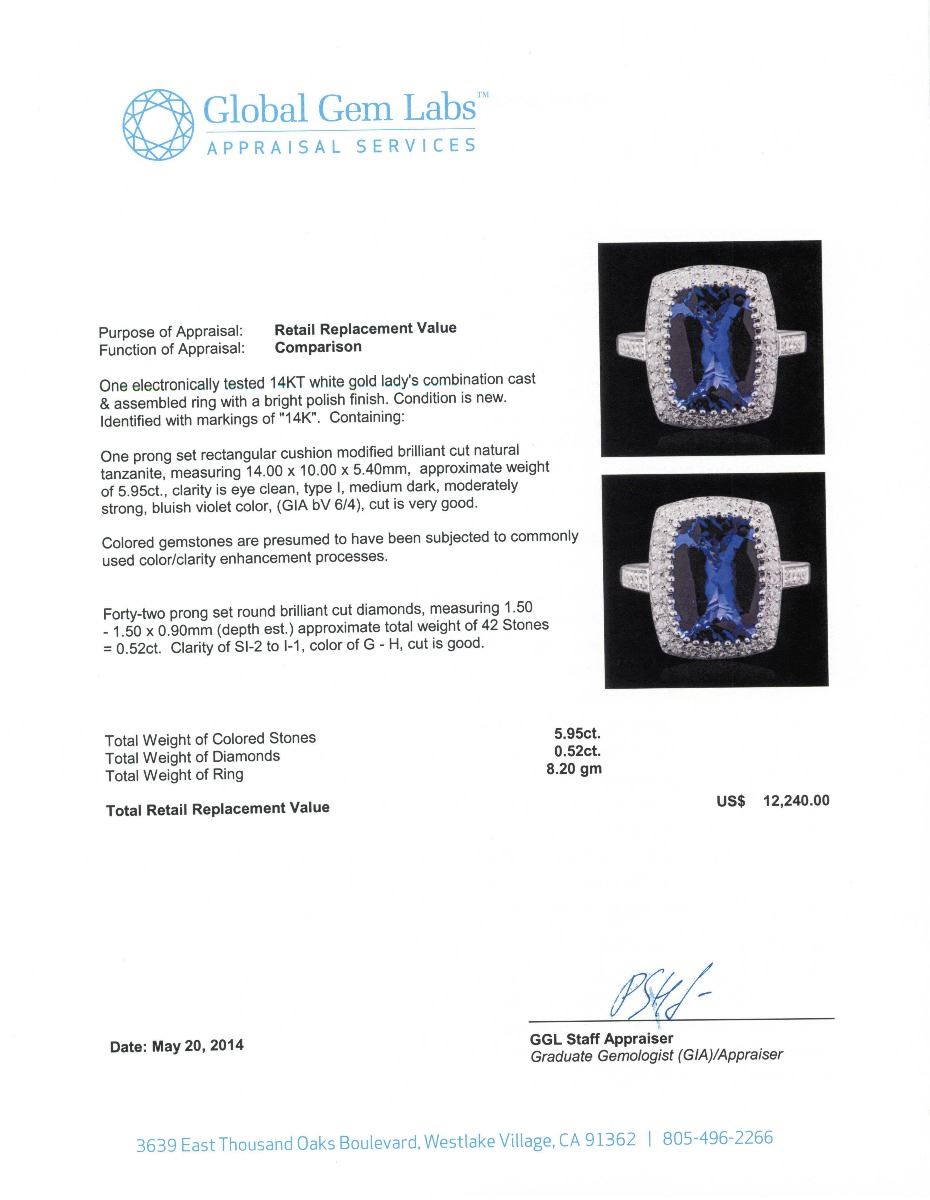 One electronically tested 14KT white gold Ladies combination cast & assembled ring with a bright polish finish. Condition is new. Identified with markings of "14K". Containing: One prong set rectangular cushion modified brilliant cut natural tanzanite, measuring 14.00 x 10.00 x 5.40mm, approximate weight of 5.95ct., clarity is eye clean, type I, medium dark, moderately strong, bluish violet color, (GIA bV 6/4), cut is very good. Colored gemstones are presumed to have been subjected to commonly used color/clarity enhancement processes. Forty-Two prong set round brilliant cut diamonds, measuring 1.50 - 1.50 x 0.90mm (depth est.) approximate. Total Weight of 42 Stones = 0.52ct. Clarity: SI-2 to I-1. Color: G - H, Cut is Good. Total Weight of Colored Stones 5.95ct. Total Weight of Diamonds 0.52ct. Total Weight of Ring 8.20 grams. GGL Appraised at $12,240.00.