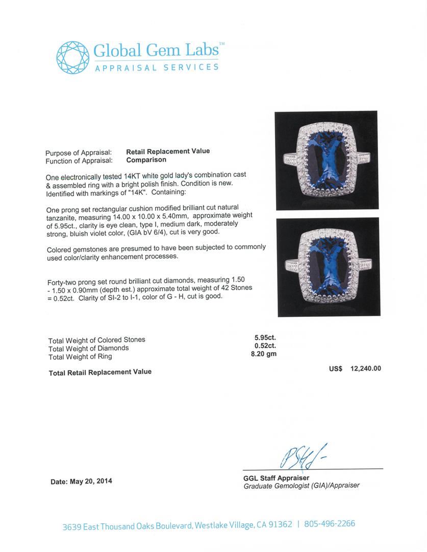 One electronically tested 14KT white gold Ladies combination cast & assembled ring with a bright polish finish. Condition is new. Identified with markings of "14K". Containing: One prong set rectangular cushion modified brilliant cut natural tanzanite, measuring 14.00 x 10.00 x 5.40mm, approximate weight of 5.95ct., clarity is eye clean, type I, medium dark, moderately strong, bluish violet color, (GIA bV 6/4), cut is very good. Colored gemstones are presumed to have been subjected to commonly used color/clarity enhancement processes. Forty-Two prong set round brilliant cut diamonds, measuring 1.50 - 1.50 x 0.90mm (depth est.) approximate. Total Weight of 42 Stones = 0.52ct. Clarity: SI-2 to I-1. Color: G - H, Cut is Good. Total Weight of Colored Stones 5.95ct. Total Weight of Diamonds 0.52ct. Total Weight of Ring 8.20 grams. GGL Appraised.