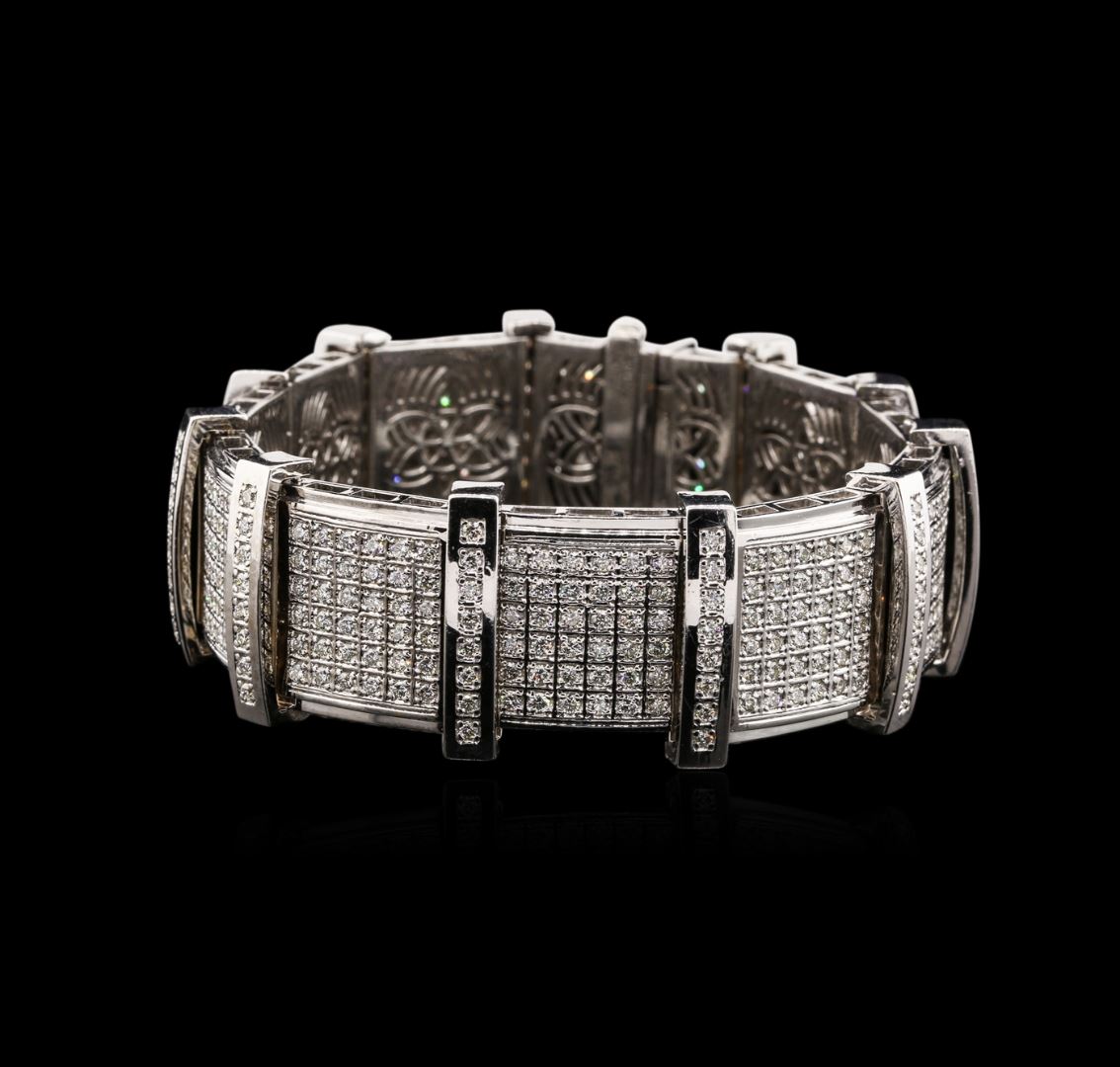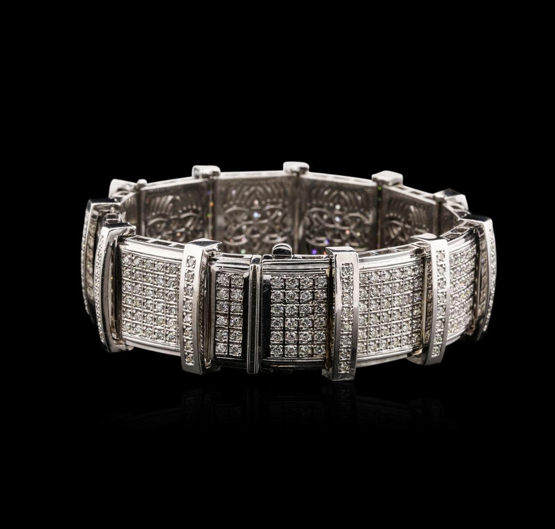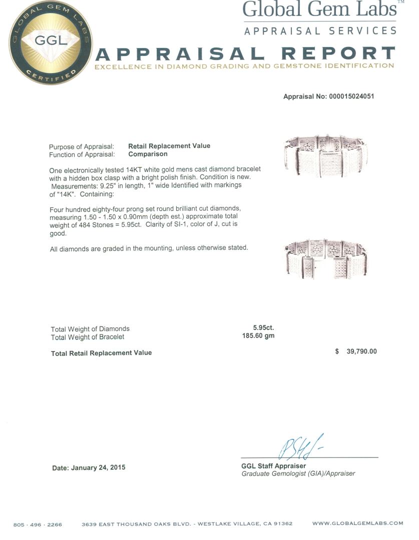 One electronically tested 14KT white gold mens cast diamond bracelet with a hidden box clasp with a bright polish finish. Measurements: 9.25" in length, 1" wide Identified with markings of "14K". Condition is new. Containing: Four Hundred Eighty-Four prong set round brilliant cut diamonds, measuring 1.50 - 1.50 x 0.90mm (depth est.) approximate total weight of 484 Stones = 5.95ct. Clarity: SI-1. Color: J, Cut is Good. All diamonds are graded in the mounting, unless otherwise stated. Total Weight of Diamonds 5.95ct. Total Weight of Bracelet 185.60 grams. GGL Appraised at $39,790.00.