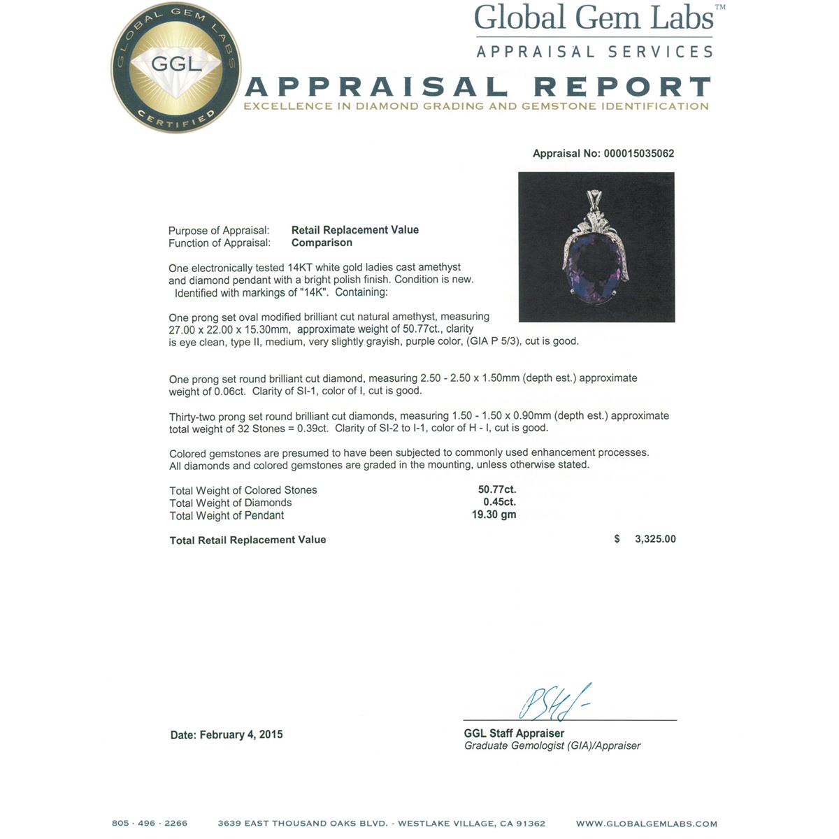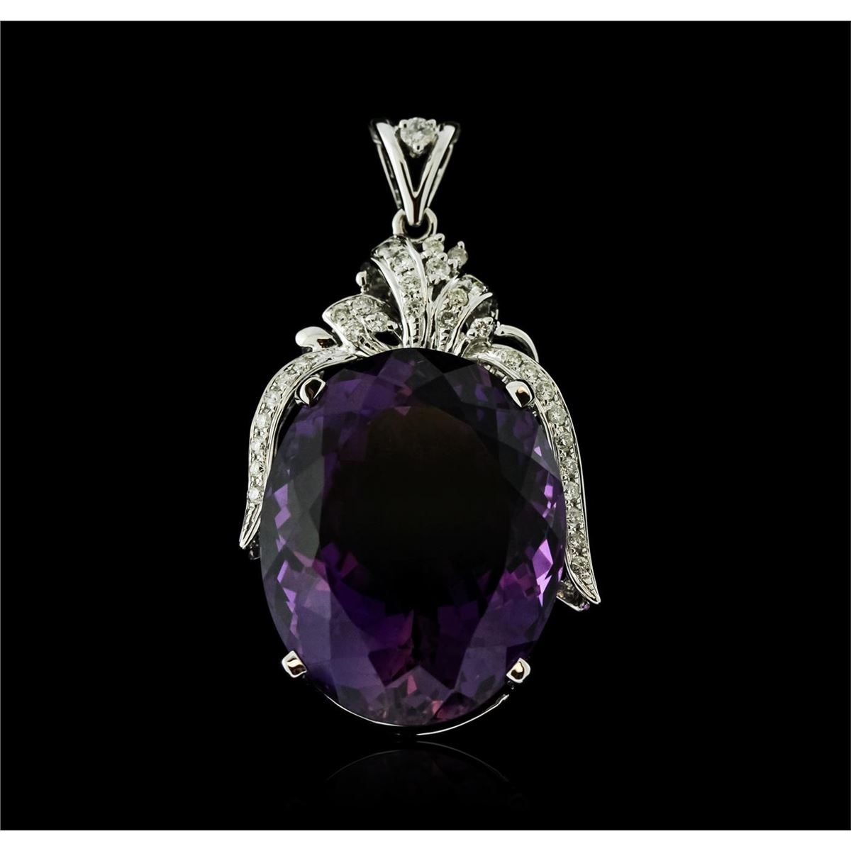 One electronically tested 14KT white gold ladies cast amethyst and diamond pendant with a bright polish finish. Identified with markings of "14K". Condition is new. Containing: One prong set oval modified brilliant cut natural amethyst, measuring 27.00. x 22.00. x 15.30mm, approximate weight of 50.77ct., clarity is eye clean, type II, medium, very slightly grayish, purple color, (GIA P 5/3), cut is good. One prong set round brilliant cut diamond, measuring 2.50 - 2.50 x 1.50mm (depth est.) approximate weight of 0.06ct. Clarity: SI-1. Color: I, Cut is Good. Thirty-Two prong set round brilliant cut diamonds, measuring 1.50 - 1.50 x 0.90mm (depth est.) approximate total weight of 32 Stones = 0.39ct. Clarity: SI-2 to I-1. Color: H - I, Cut is Good. Colored gemstones are presumed to have been subjected to commonly used enhancement processes. All diamonds and colored gemstones are graded in the mounting, unless otherwise stated. Total Weight of Colored Stones 50.77ct. Total Weight of Diamonds 0.45ct. Total Weight of Pendant 19.30 grams. GGL Appraised at $3,325.00.
