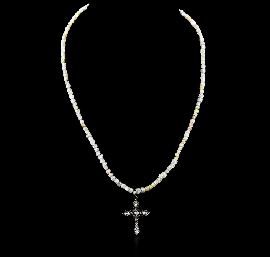 One necklace featuring: 14KT white gold weighing 13.20 grams containing rough diamonds with a total weight of 51.89cts and a cross charm containing pave set round cut diamonds with a total weight of 0.35cts.
