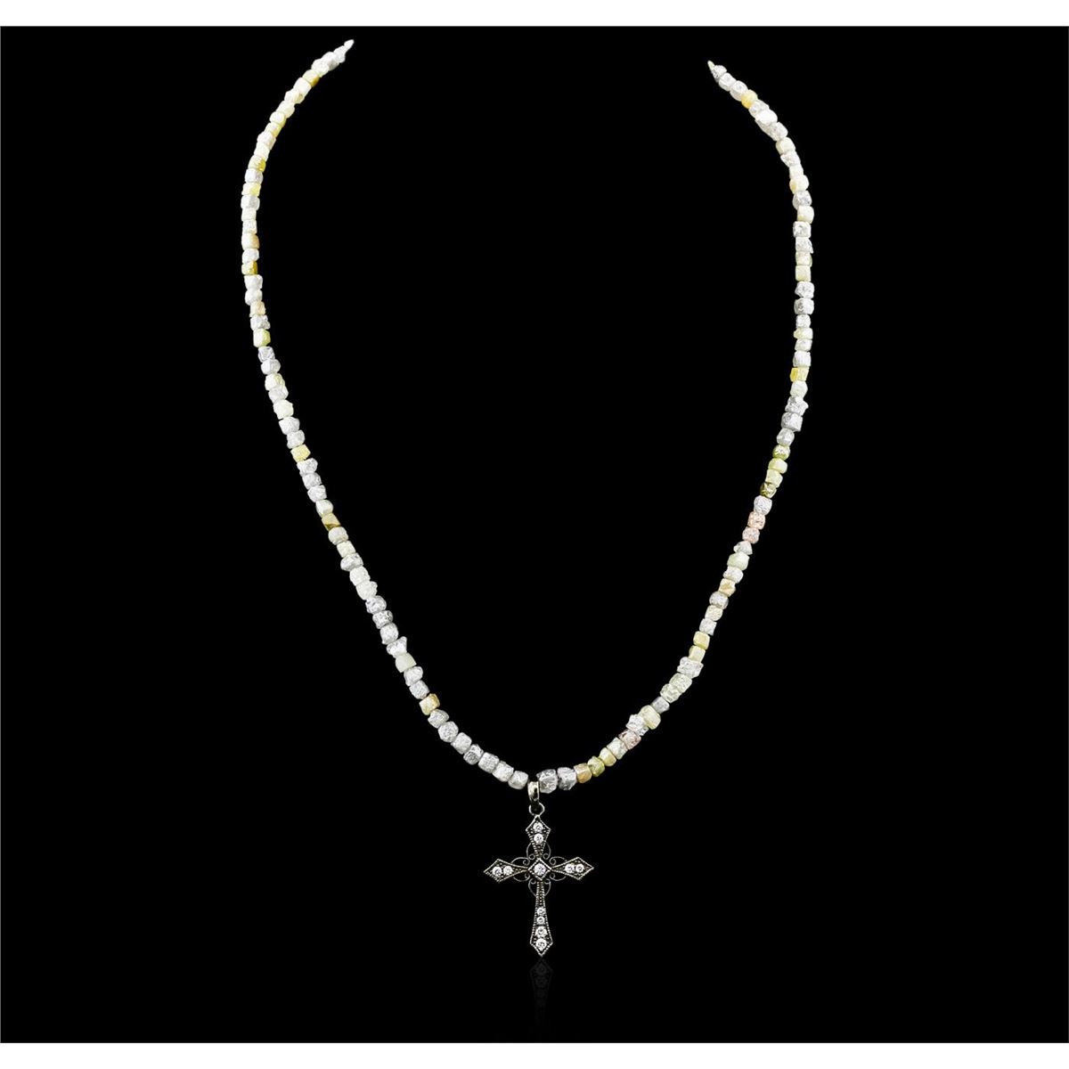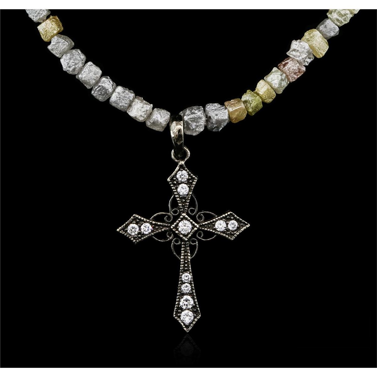 One necklace featuring: 14KT white gold weighing 13.20 grams containing rough diamonds with a total weight of 51.89cts and a cross charm containing pave set round cut diamonds with a total weight of 0.35cts.
