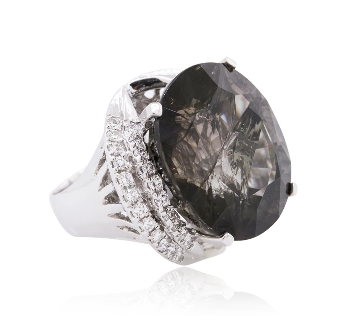 One electronically tested 14KT white gold ladies combination cast & assembled tourmaline and diamond ring with a bright polish finish. Condition is new. Containing: One prong set oval modified brilliant cut natural green tourmaline, measuring 24.80 x 23.02 x 15.31mm, approximate weight of 56.17ct., clarity is moderately included, type I, medium, grayish, green color, (GIA G 5/1), cut is good. Forty-Four prong set round brilliant cut diamonds, measuring 2.00 - 1.50 x 1.05mm (depth est.) approximate total weight of 44 Stones = 0.86ct. Clarity: SI-1 to I-1. Color: H - J, Cut is Good. Colored gemstones are presumed to have been subjected to commonly used enhancement processes. All diamonds and colored gemstones are graded in the mounting, unless otherwise stated. Total Weight of Colored Stones 56.17ct. Total Weight of Diamonds 0.86ct. Total Weight of Ring 28.70 grams. GGL Appraised at $19,510.00.