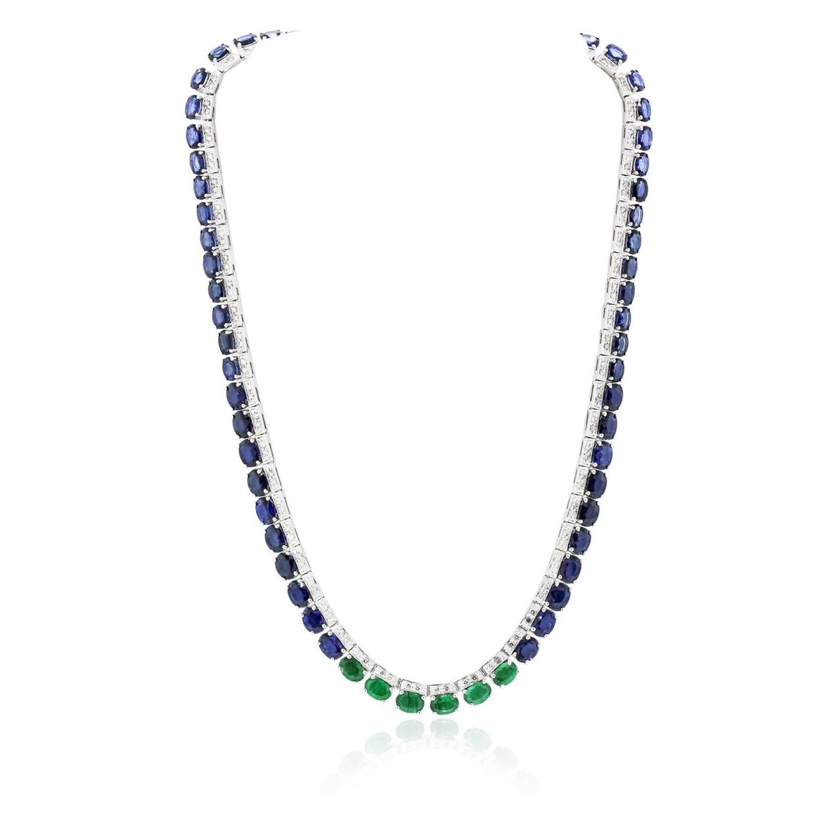 One electronically tested 14KT white gold ladies combination cast & assembled emerald, sapphire and diamond necklace with a hidden box clasp with a bright polish finish. Measurements: 17.25" in length. Condition is new. Containing: Sixty prong set oval modified brilliant cut natural blue sapphires, measuring 7.00 x 5.00 x 3.25mm, approximate total weight of 57.60ct., clarity is eye clean, type II, medium, moderately strong, blue color, (GIA B 5/4), cut is good. Six prong set oval modified brilliant cut natural emeralds, measuring 6.80 x 4.50 x 2.93mm, approximate total weight of 3.06ct., clarity is moderately included, type III, medium light, very slightly grayish, green color, (GIA G 4/3), cut is good. One Hundred Thirty-Two prong set round brilliant cut diamonds, measuring 1.50 - 1.50 x 0.90mm (depth est.) approximate total weight of 132 Stones = 1.62ct. Clarity: SI-1 to SI-2. Color: J, Cut is Good. Colored gemstones are presumed to have been subjected to commonly used enhancement processes. All diamonds and colored gemstones are graded in the mounting, unless otherwise stated. Total Weight of Colored Stones 60.66ct. Total Weight of Diamonds 1.62ct. Total Weight of Necklace 42.30 grams. GGL Appraised at $26,190.00.